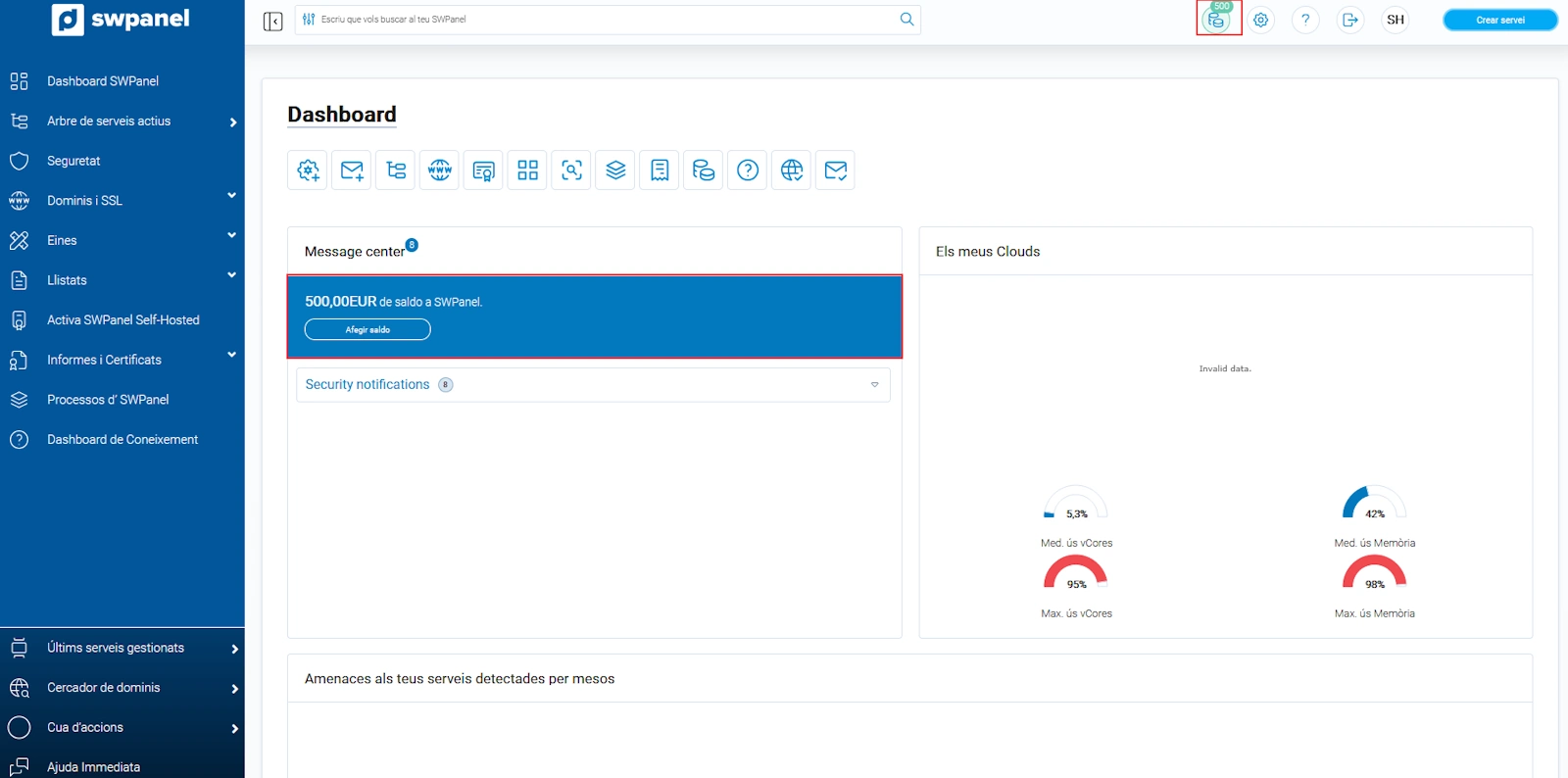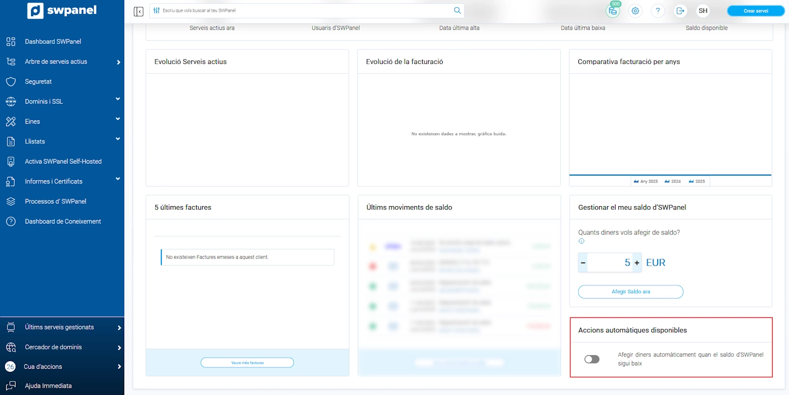 Finalment, existeix també la possibilitat que es carregui saldo de manera automàtica quan el sistema detecti que estàs per sota del saldo mínim de 5,00€. Per a això has d'accedir al Dashboard de Client:
