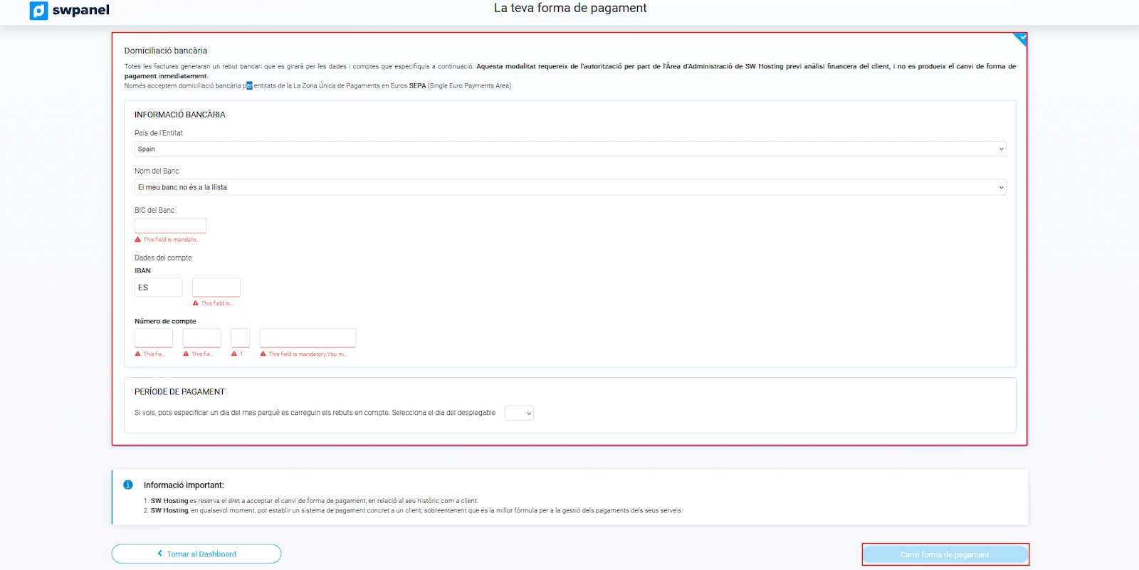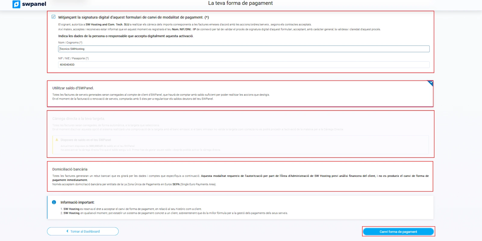 Hi ha també la possibilitat de canviar el mètode de pagament perquè en lloc d'utilitzar el saldo d' SWPanel, es carreguin directament l'import de les factures mensuals a la targeta de crèdit.