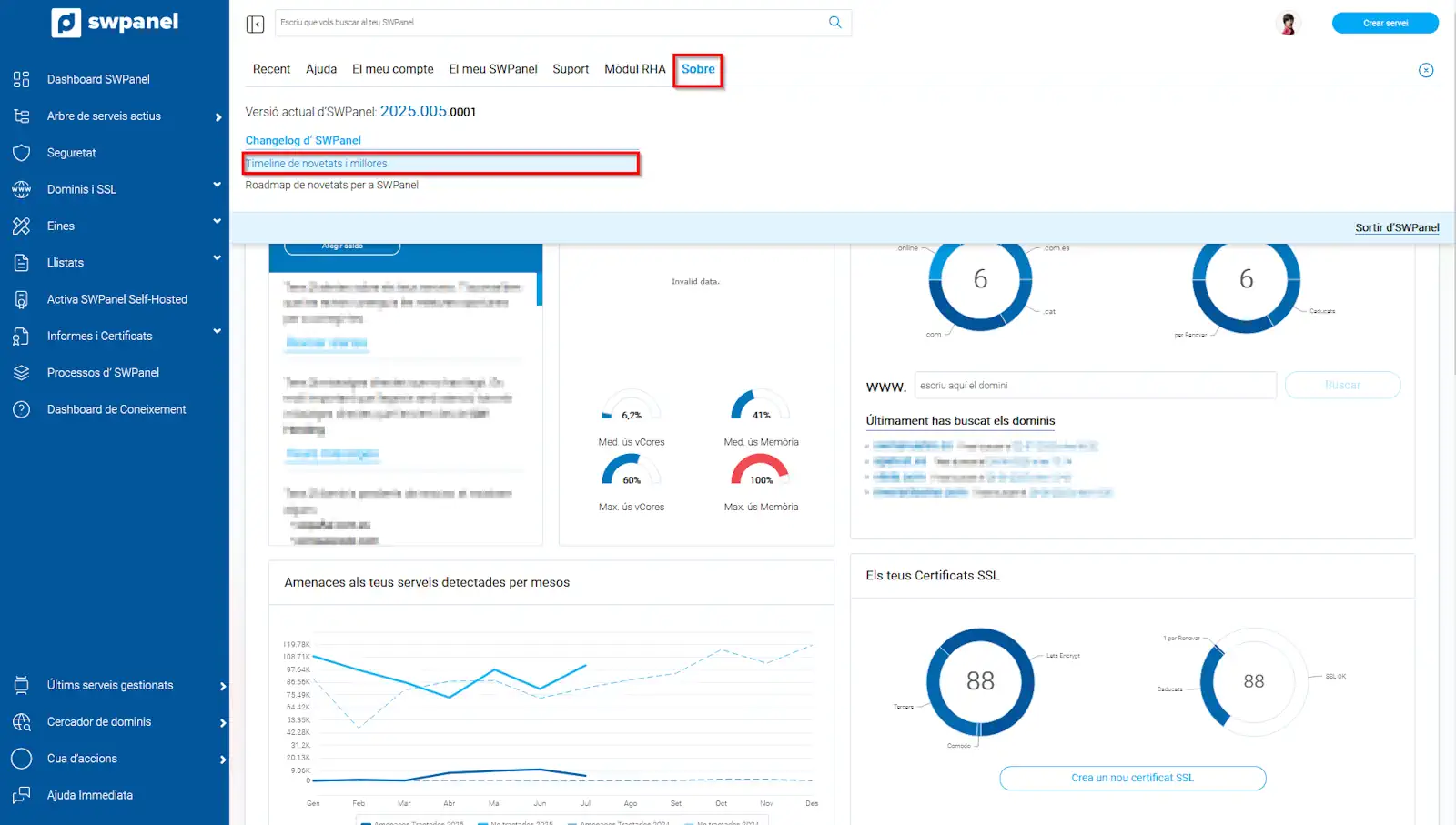 Disposar d’un timeline i un roadmap et permet visualitzar de manera clara l’evolució de SWPanel i les millores que s’hi van implementant. Això aporta transparència, planificació i confiança, ja que es poden anticipar novetats i comprovar el progrés realitzat. Per visualitzar-les, en primer lloc, hauràs de fer clic al teu perfil, situat a la part superior dreta de SWPanel.