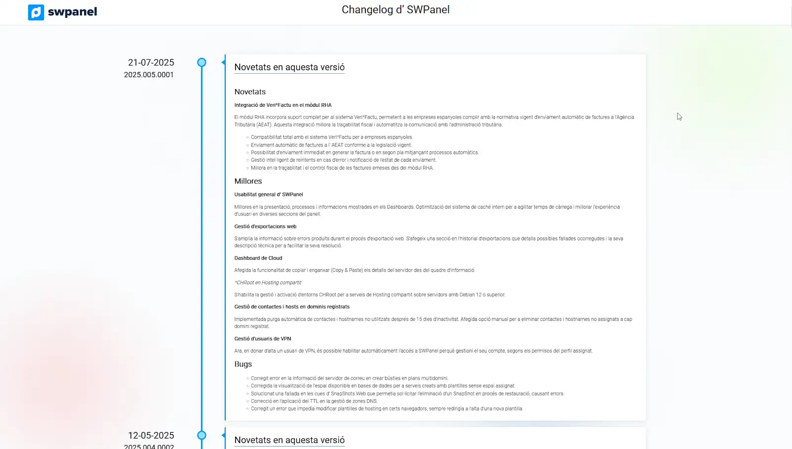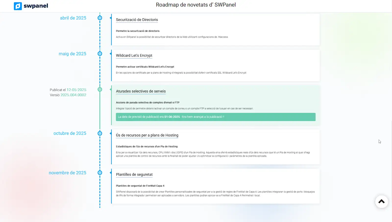 En aquesta secció es mostra el Roadmap de novetats de SWPanel, on es detallen les noves funcions i millores publicades en diferents dates i versions, i on podràs consultar quins canvis s’han incorporat, les seves descripcions i les previsions de publicació.