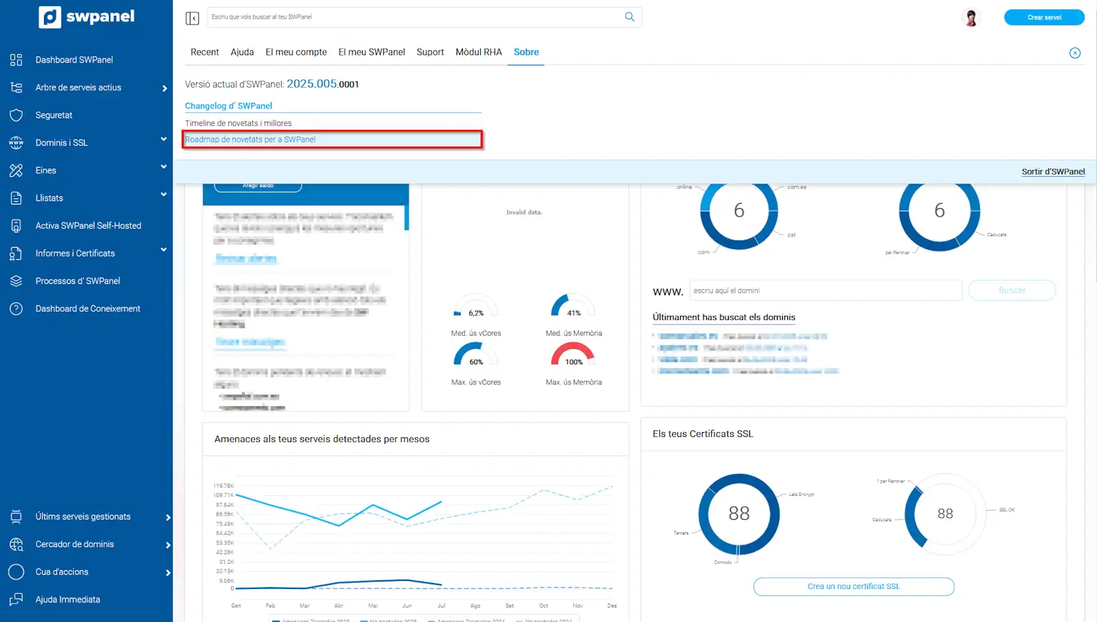 Per veure el full de ruta d’accions, des de "Sobre", hauràs de fer clic a "Roadmap de novetats per a SWPanel".