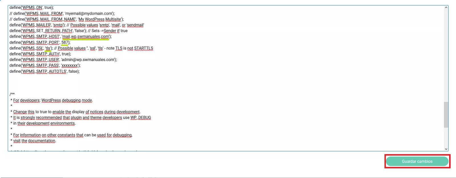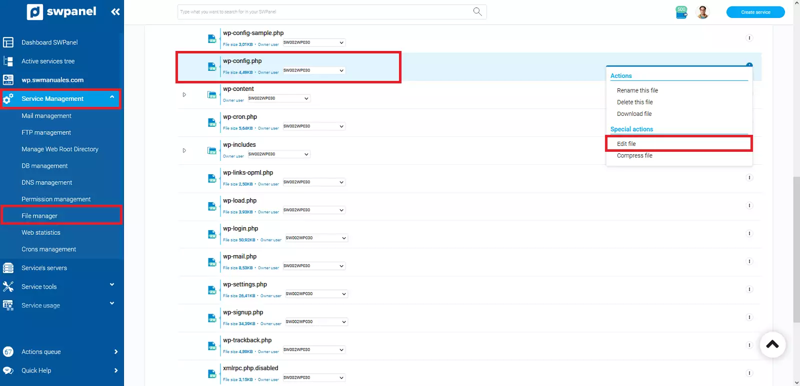 Gestions sobre el servei -> Gestor de Fitxers -> wp-config.php -> Editar fitxer