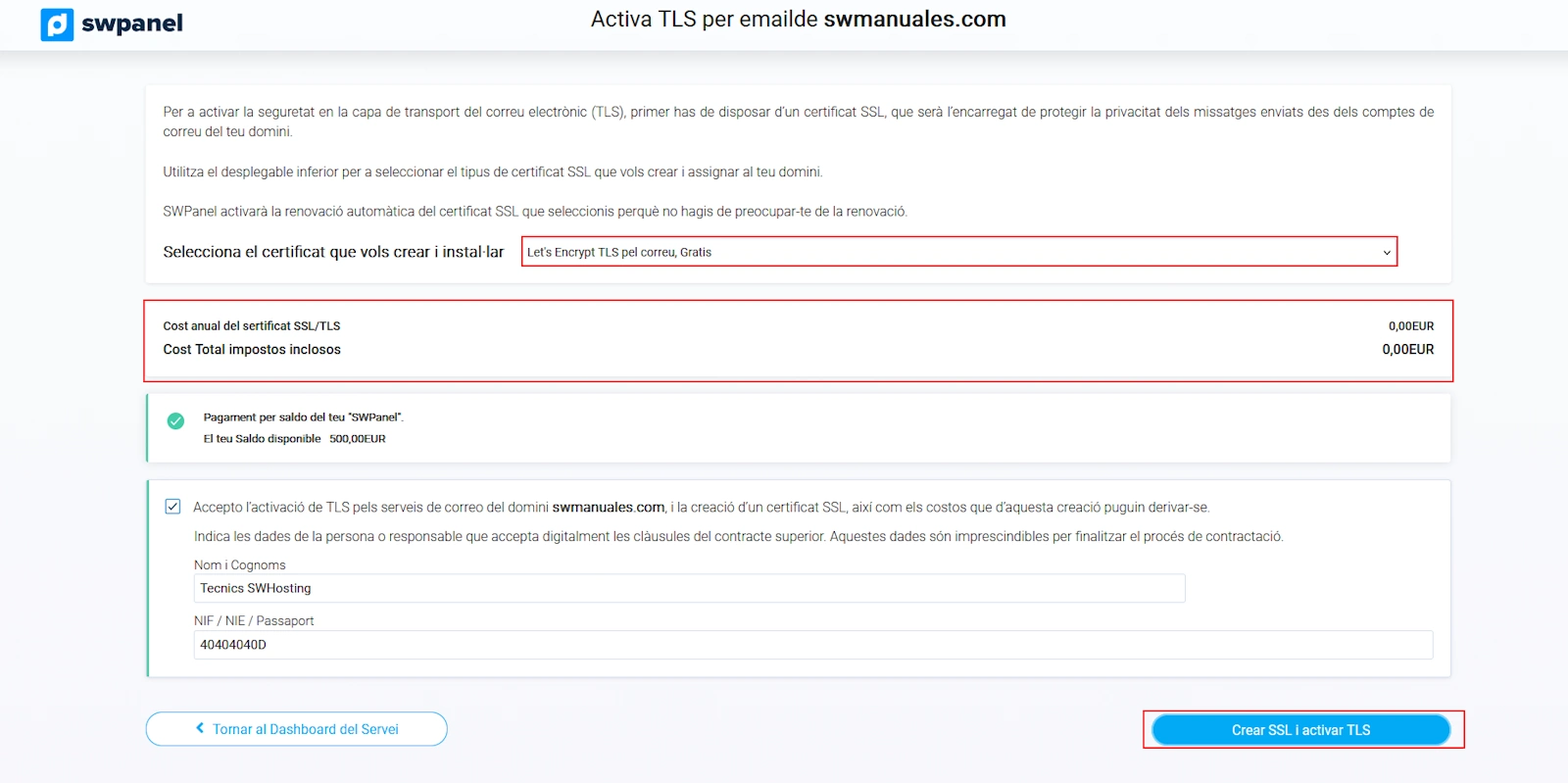 Si els paràmetres no coincideixen, el sistema no et permetrà crear el SSL.