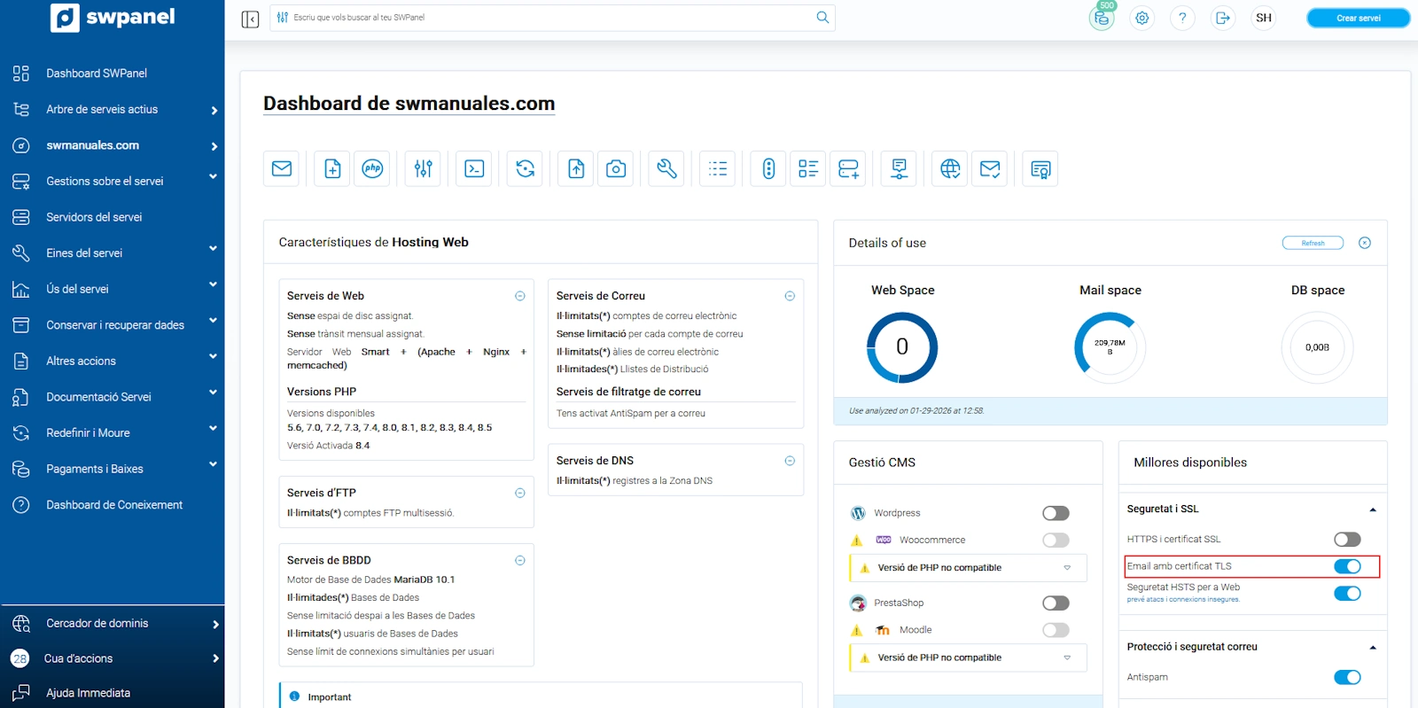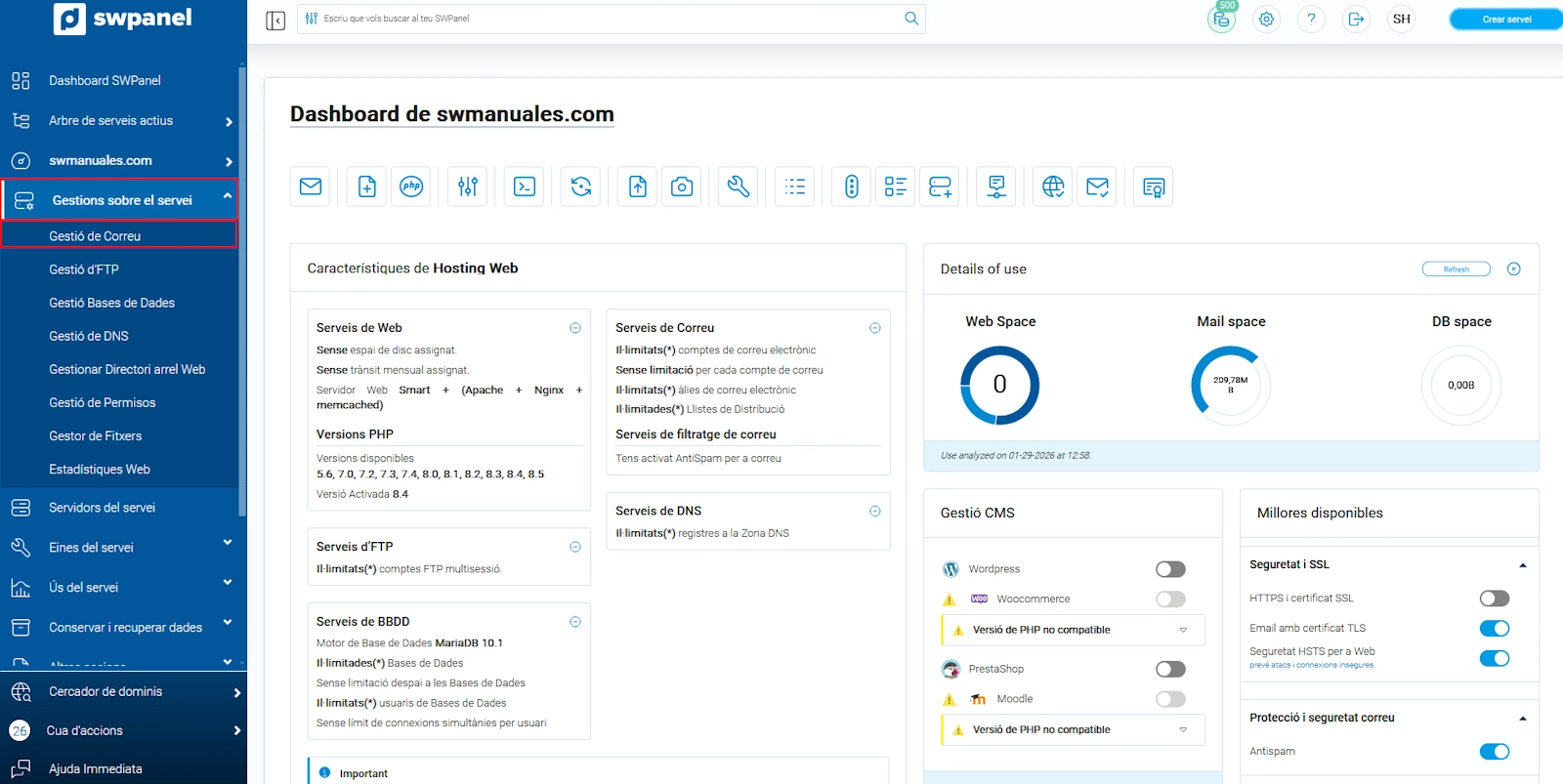 Dins del Dashboard del servei, en el menú lateral esquerre, prem en "Gestions sobre el servei" i a continuació prem en "Gestió de Correu":