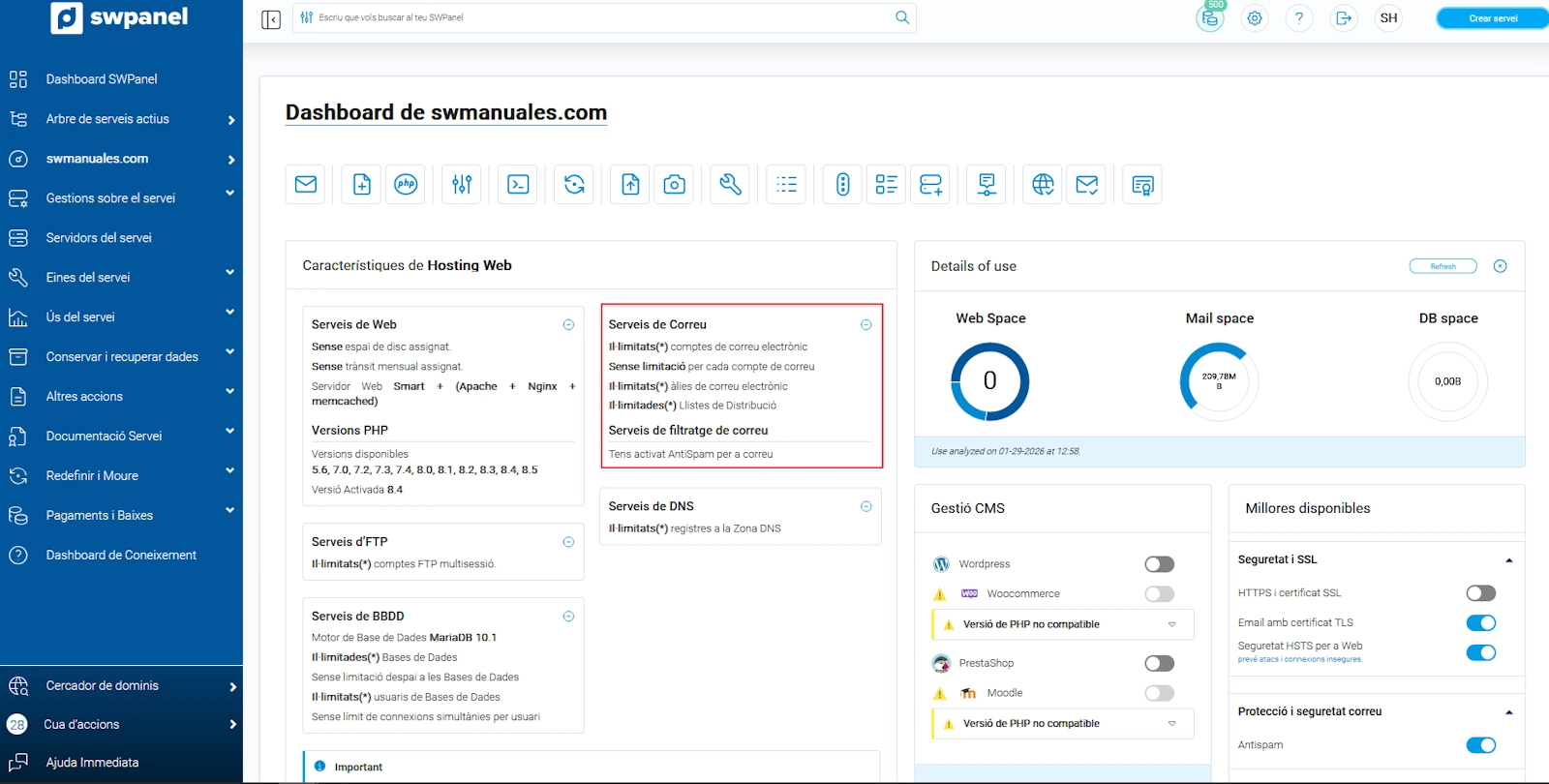 Dins d'un Hosting Compartit podràs tenir la quantitat de comptes de correu que s'especifiquen en el moment de la contractació. Pots veure la quantitat de comptes de correu que es poden crear en el teu servei, en el dashboard d'aquest, en el requadre d'especificacions.