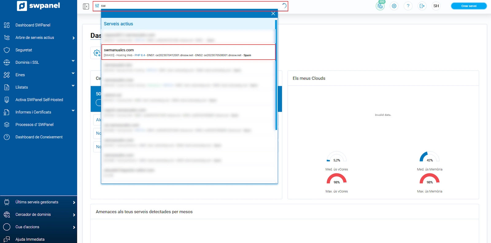 En la barra de cerca de la part superior del Panell, introduïm el nom del servei de Hosting en el qual volem activar els protocols de seguretat. Una vegada aparegui, premem sobre ell per a accedir al Dashboard: