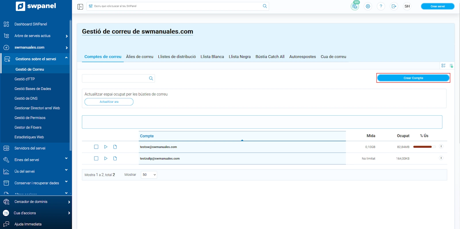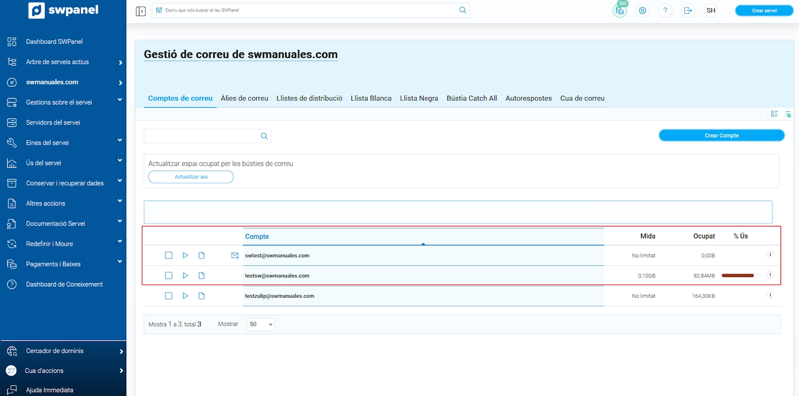 Una vegada s'hagi creat, ens apareixerà en la pantalla de gestió de correu, amb les característiques que hem configurat, perquè puguem veure tots els nostres comptes i el seu estat alhora: