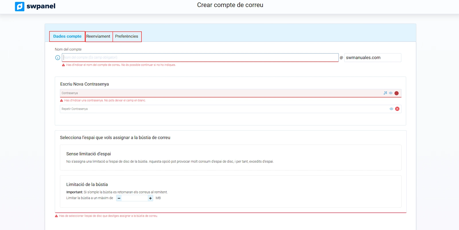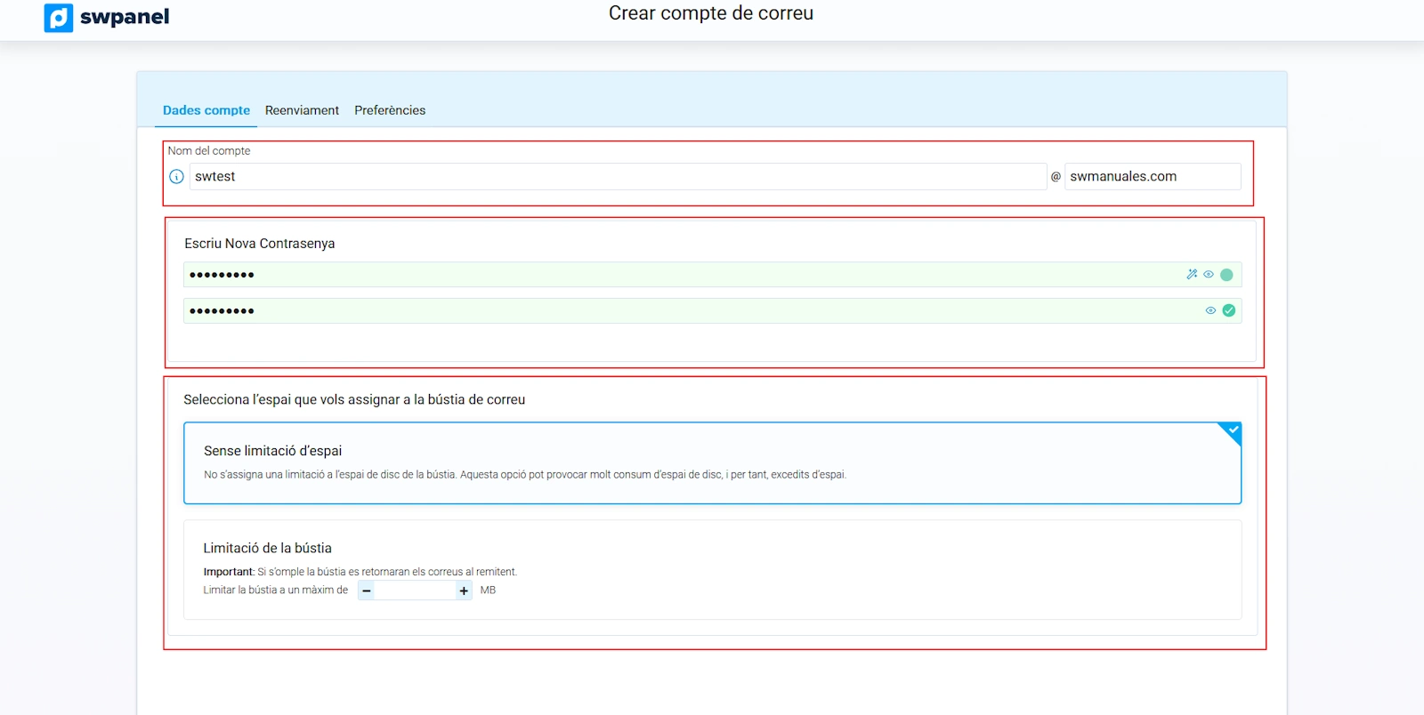 • Contrasenya: especifiquem quina serà la clau d'accés al compte de correu. En compliment de la normativa ISO 27001, la LOPD i la RGPD, no emmagatzemem ni proporcionem claus personals, així com no tenim accés a les claus de comptes de correu ni molt menys les proporcionem, de manera que és important recordar aquesta clau. En cas de perdre-la, es pot modificar més endavant a través de l 'SWPanel.