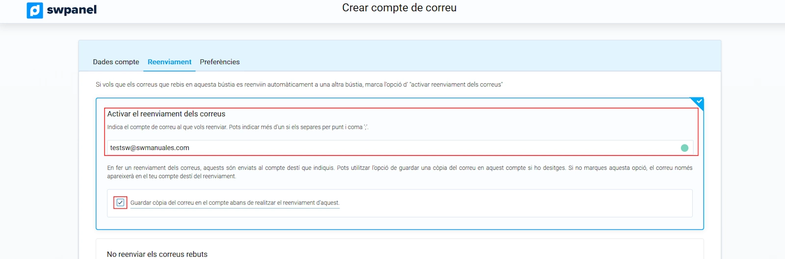 També podem especificar si volem Guardar còpia del correu en el compte abans de realitzar el reenviament del mateix o no. Important, marcant el check, seleccionem que sí que volem guardar una còpia del correu en el compte. En cas de no tenir-ho marcat, la còpia no es guardarà.