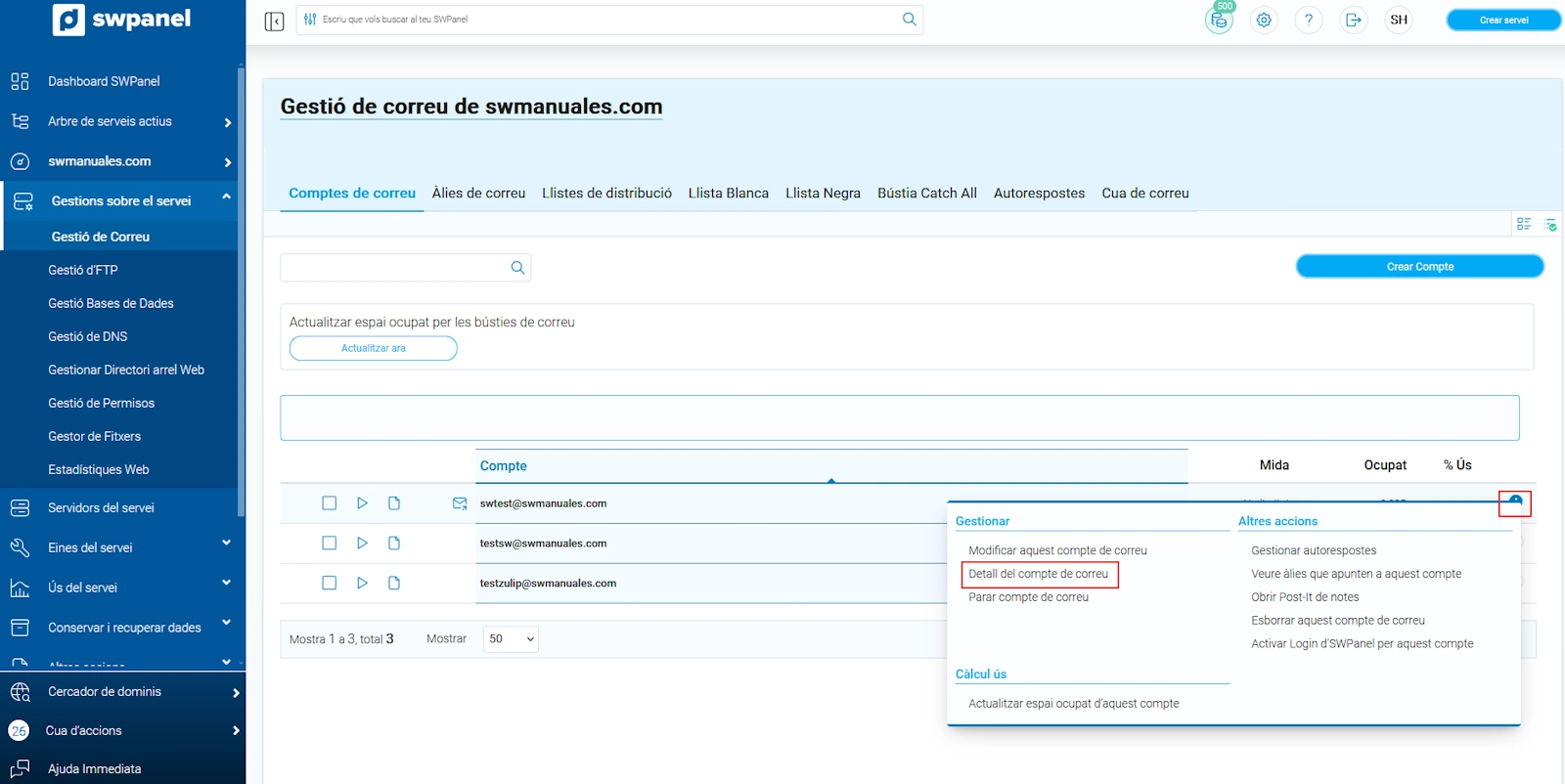 Si volem veure l'ús, redireccions i missatges automàtics dels nostres comptes, hem d'anar al detall del compte de correu.