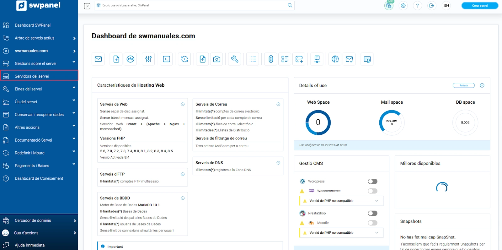 Una vegada dins del dashboard del servei, en el menú lateral blau, premem en "Servidors del servei":