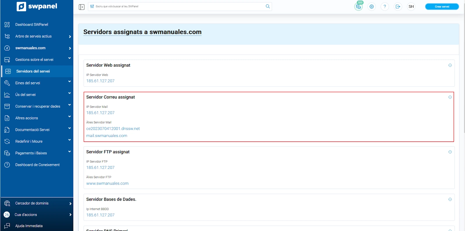 Una vegada dins, veurem les dades corresponents a "Servidor Correu assignat":