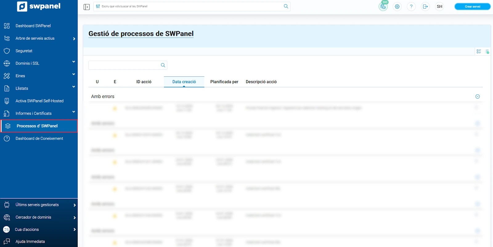 El SWPanel variarà depenent del tipus de serveis que contractis (si disposes de servidors Cloud, suport, seguretat, etc.), però les accions més bàsiques es realitzen de la mateixa manera disposis dels serveis que disposis.