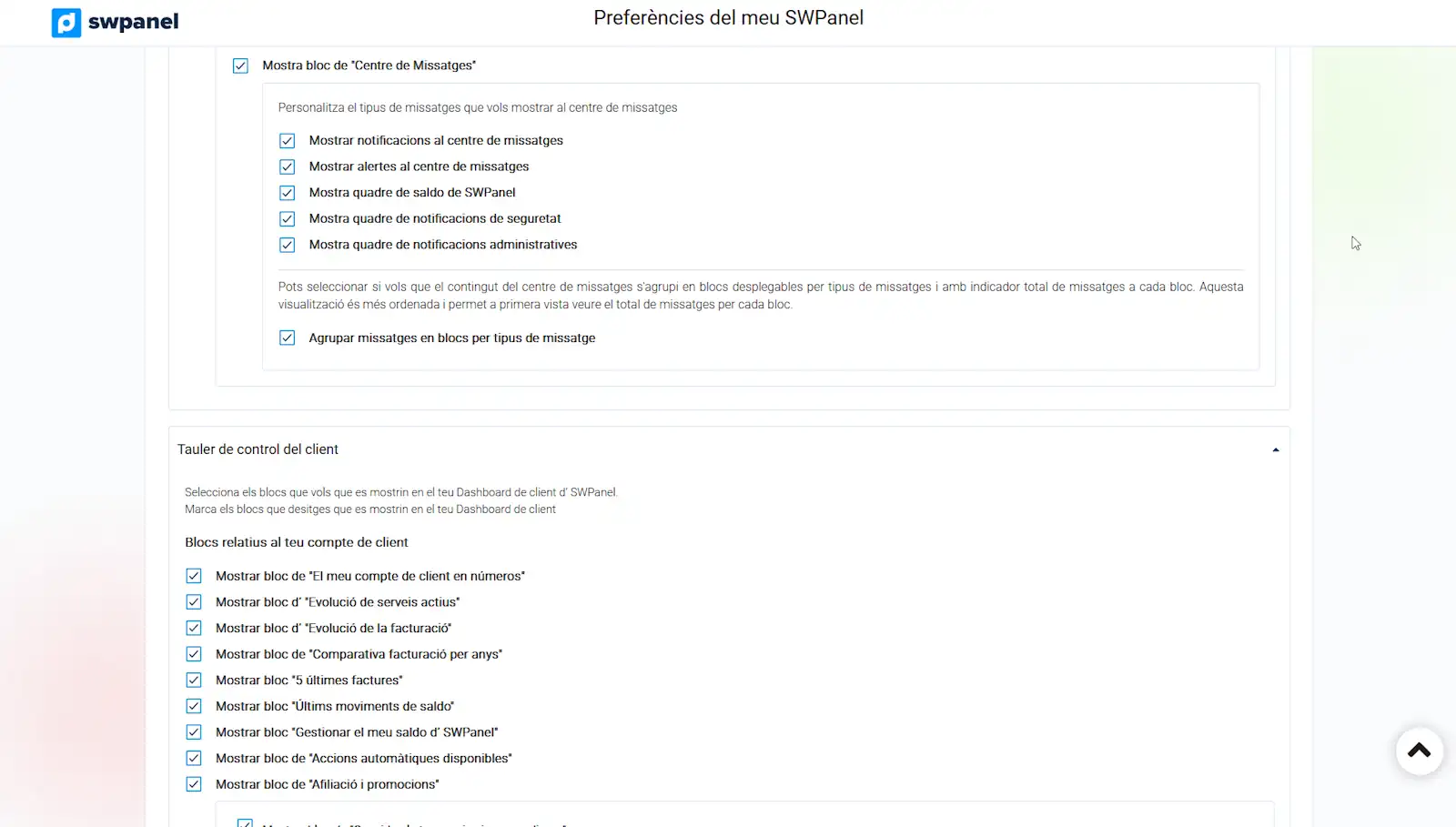 Des d'aquest apartat pots configurar les opcions i aparença relacionades amb el teu Dashboard d’ SWPanel, entre elles el Dashboard general d’ SWPanel, de client, de xarxa d'afiliats, el bloc de centre de missatges, de servei, d'anàlisi i ús de recursos de Cloud, dashboard del mòdul RHA, etc.