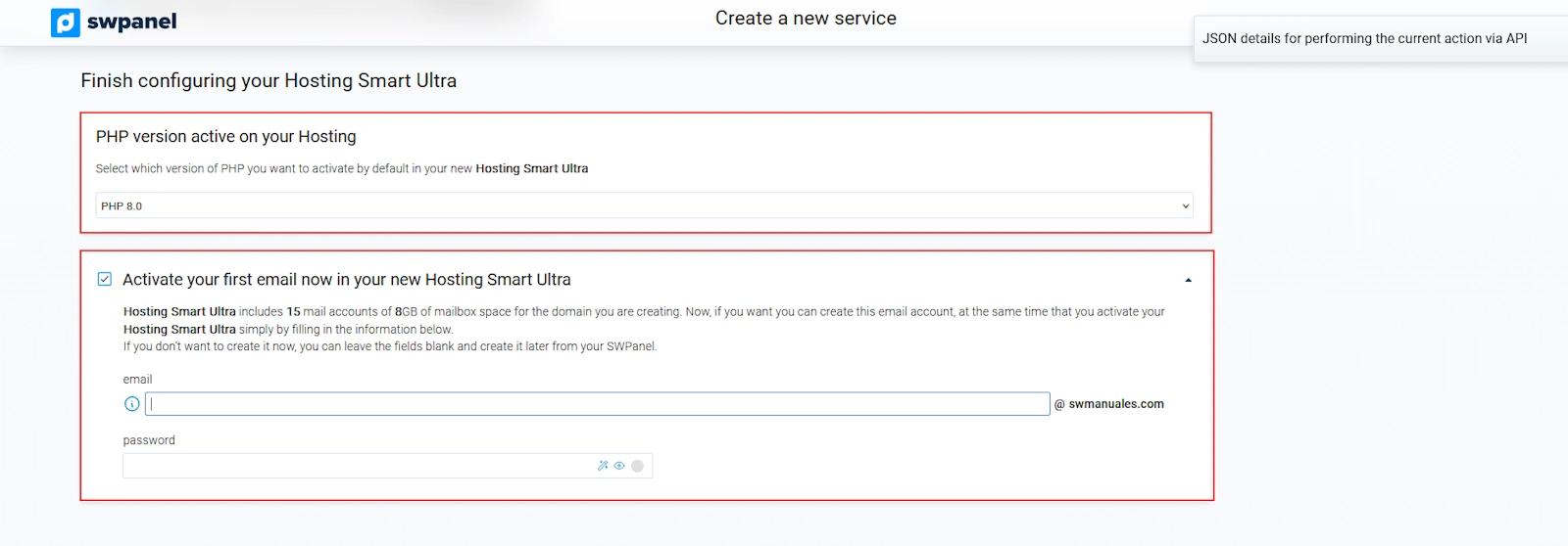 Now you will be able to adjust your new Hosting to your needs: PHP version and the creation of an email account for the specified domain:
