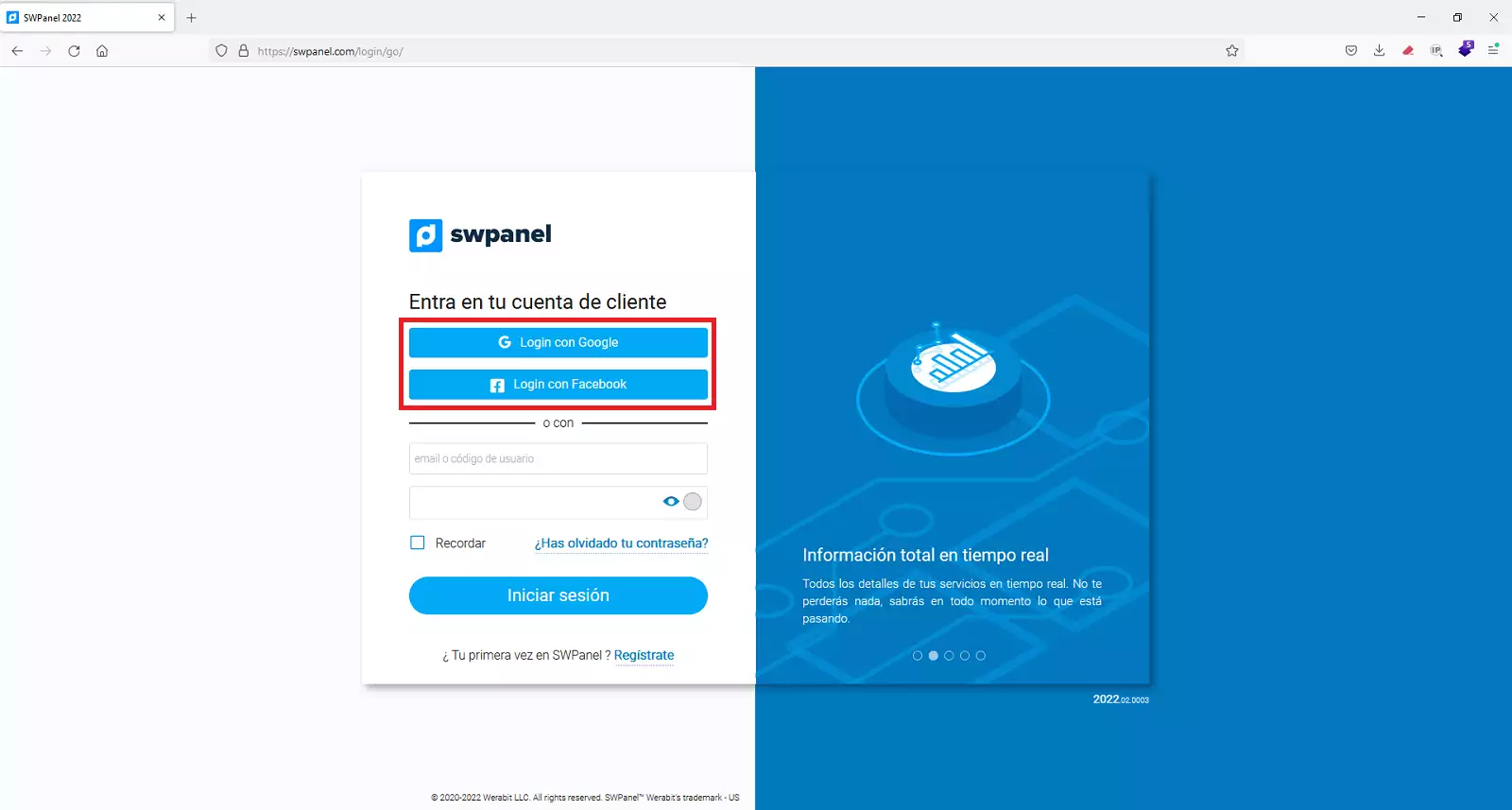 Thus, when accessing your SWPanel client account from the URL https://swpanel.com/login/go/ you will be able to use your Google or Facebook account to log in automatically and without the need to enter the username and password.