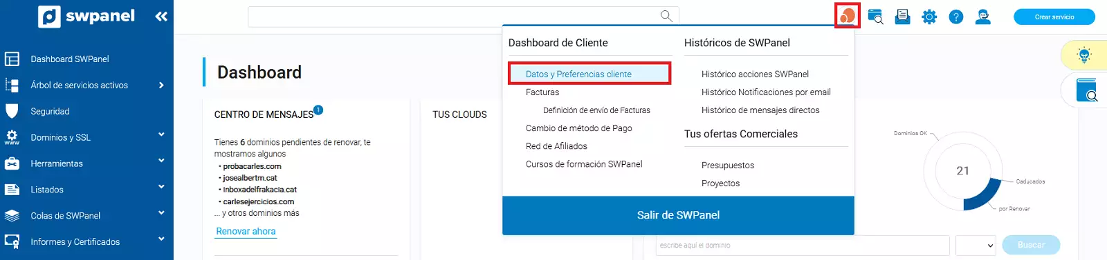 1) Log in to your SWPanel user account and go to the section "Customer Data and Preferences ".