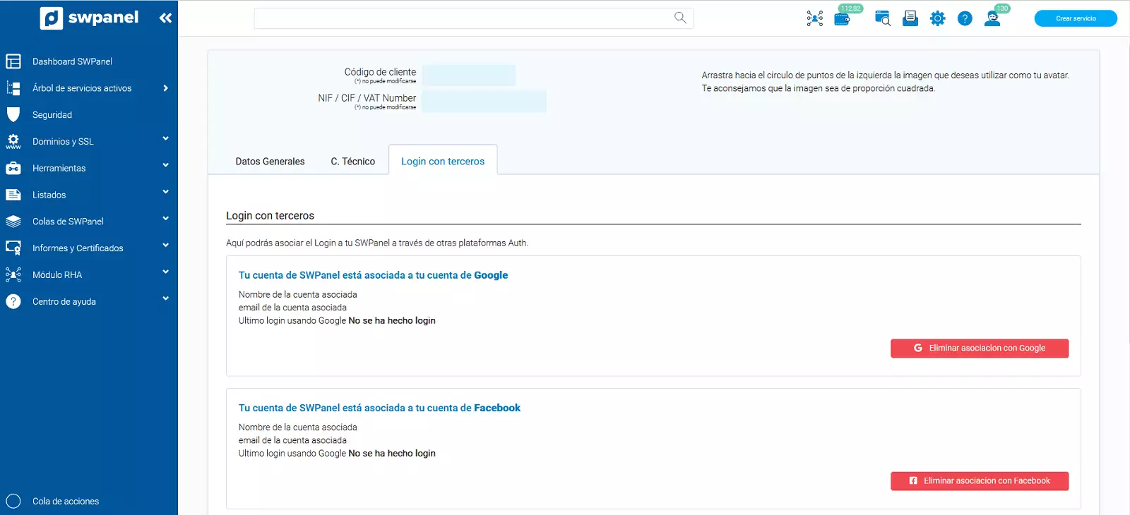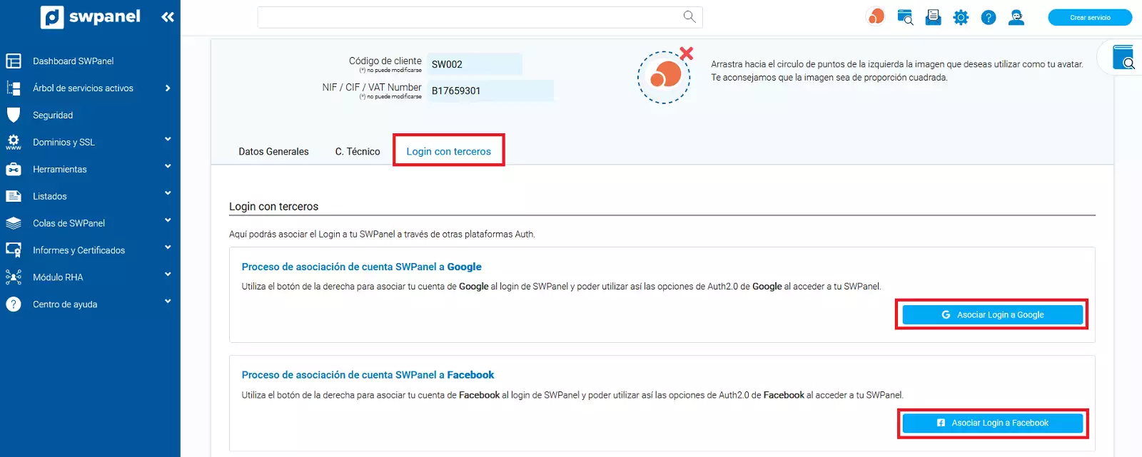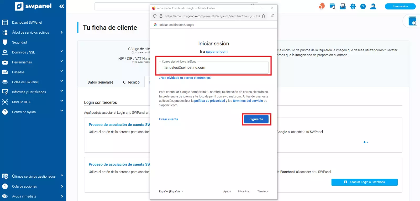To associate your SWPanel login to your Google or Facebook accounts you must follow the following steps: