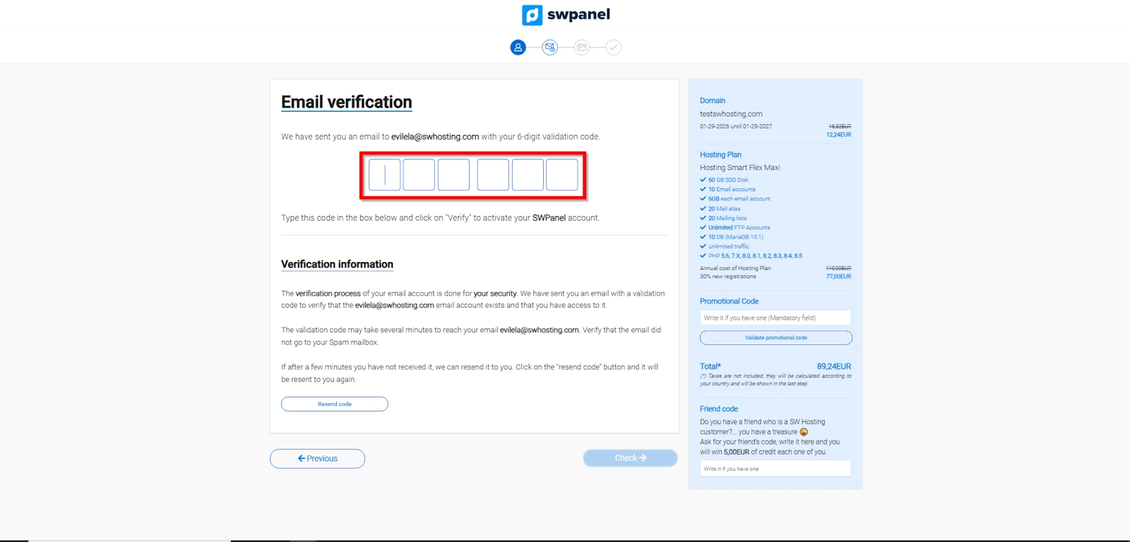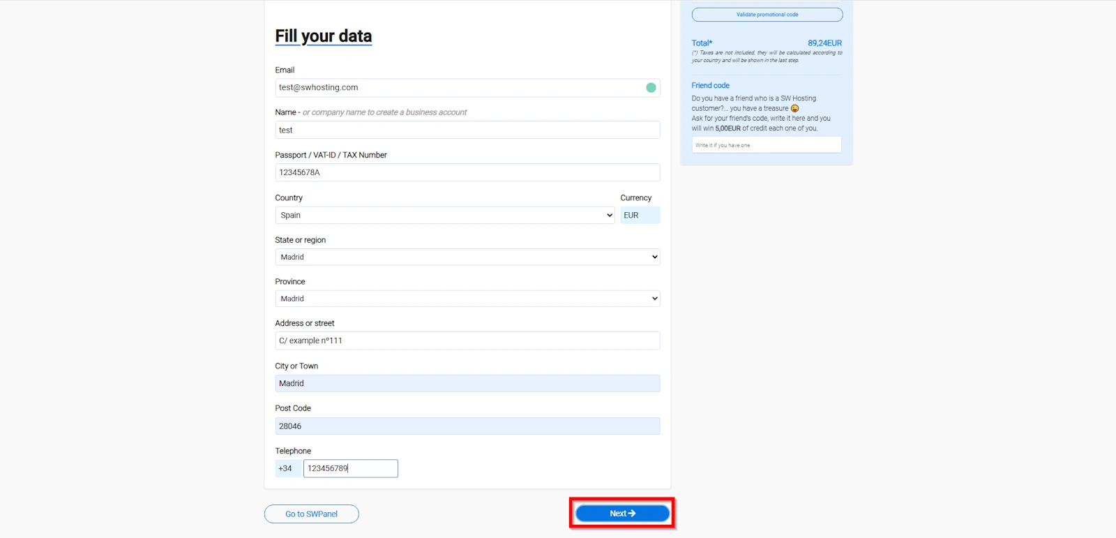 Go to the SWPanel page to enter your personal and contact information.