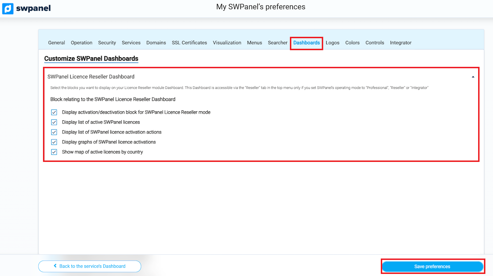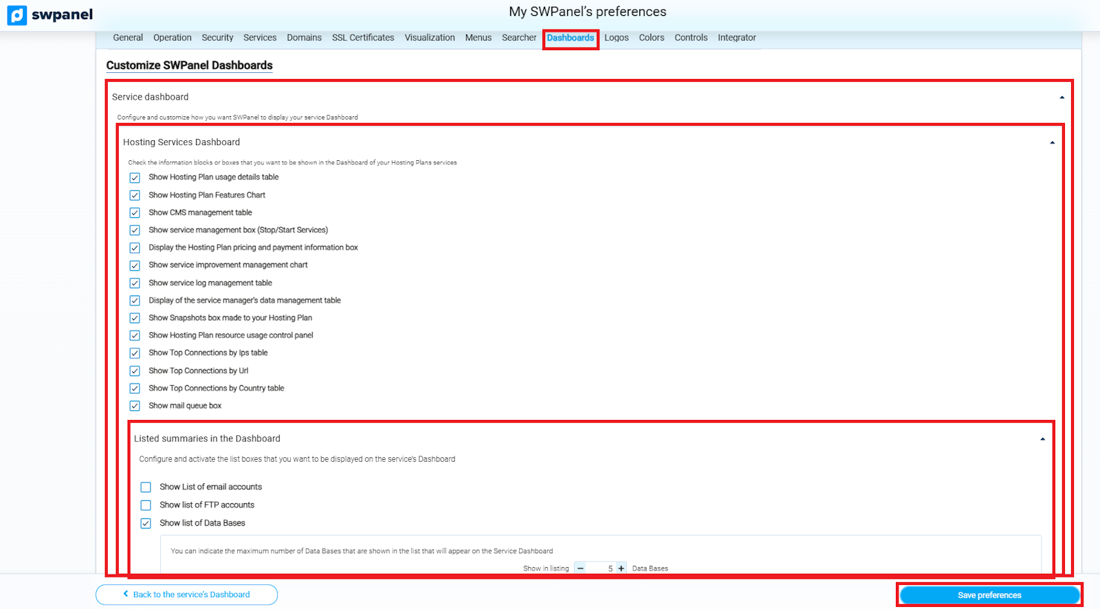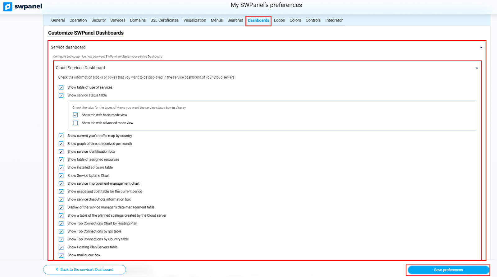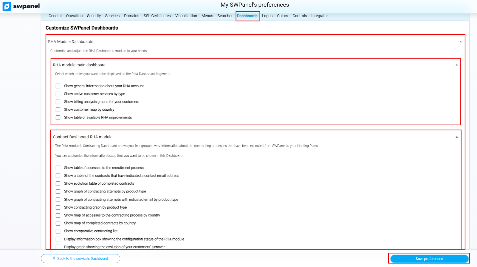 Desde este apartado puedes configurar y personalizar los diferentes Dashboards de SWPanel, incluyendo el Dashboard general, de cliente, de la Red de SW Ambassadors, módulo Integrador, revendedor de licencias, trazabilidad, soporte, servicios, WordPress, Cloud y módulo RHA.