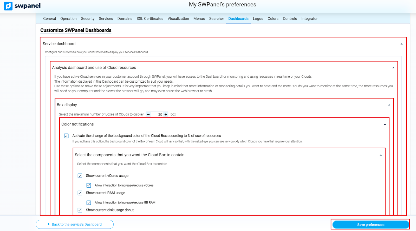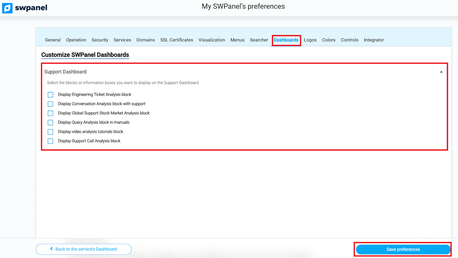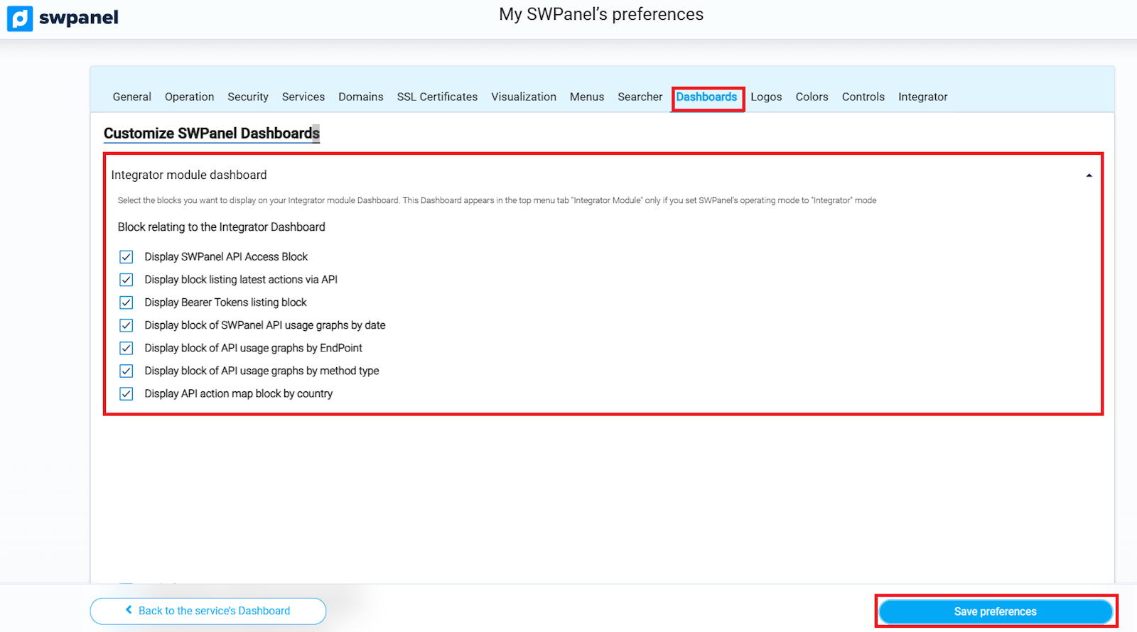 Desde este apartado puedes configurar y personalizar los diferentes Dashboards de SWPanel, incluyendo el Dashboard general, de cliente, de la Red de SW Ambassadors, módulo Integrador, revendedor de licencias, trazabilidad, soporte, servicios, WordPress, Cloud y módulo RHA.