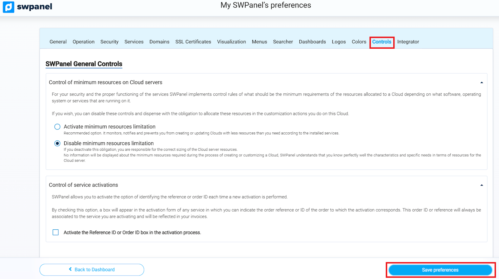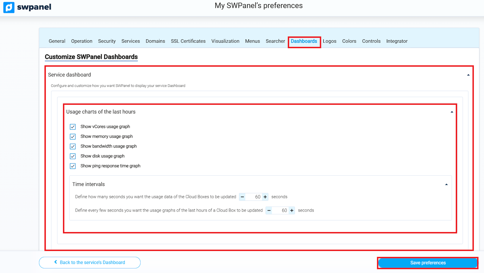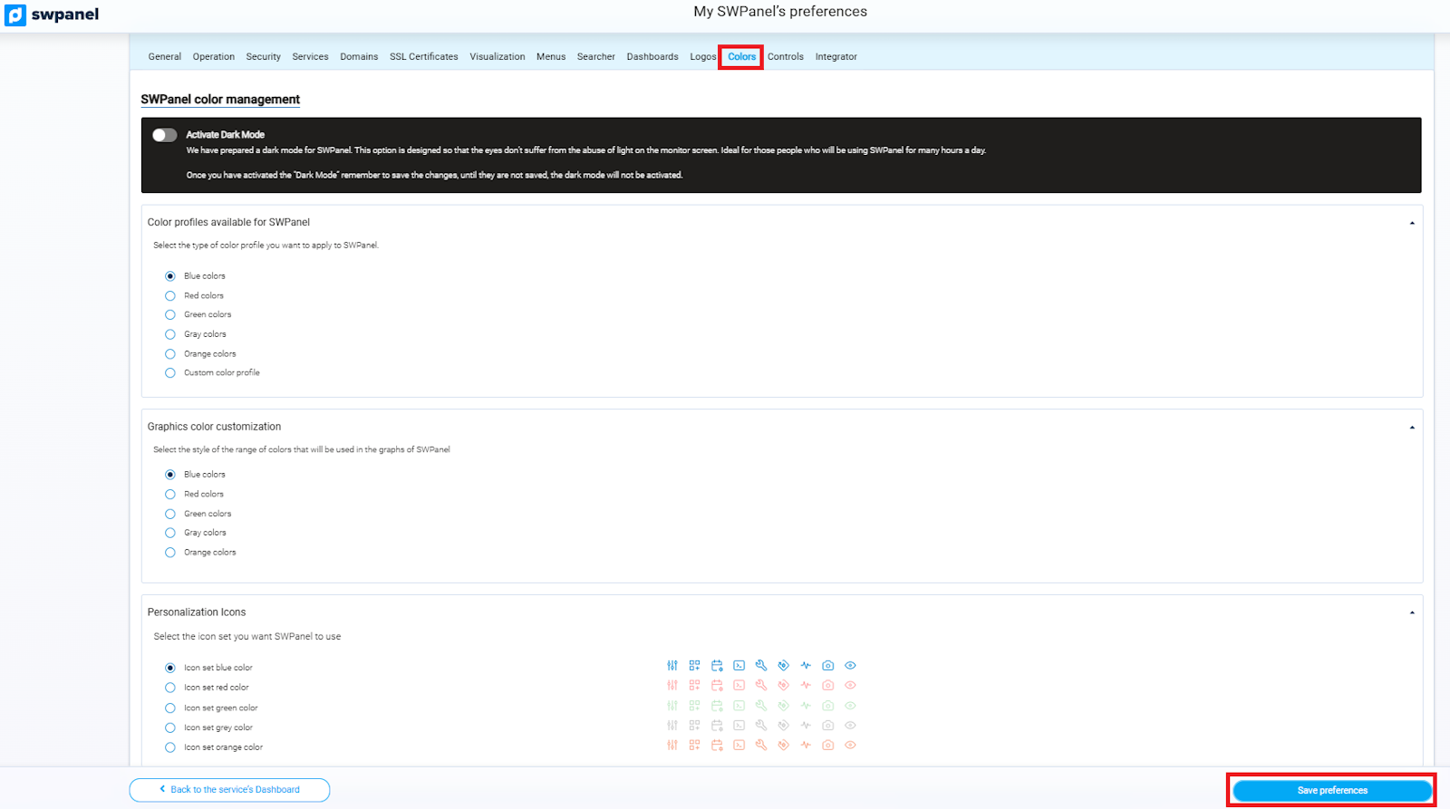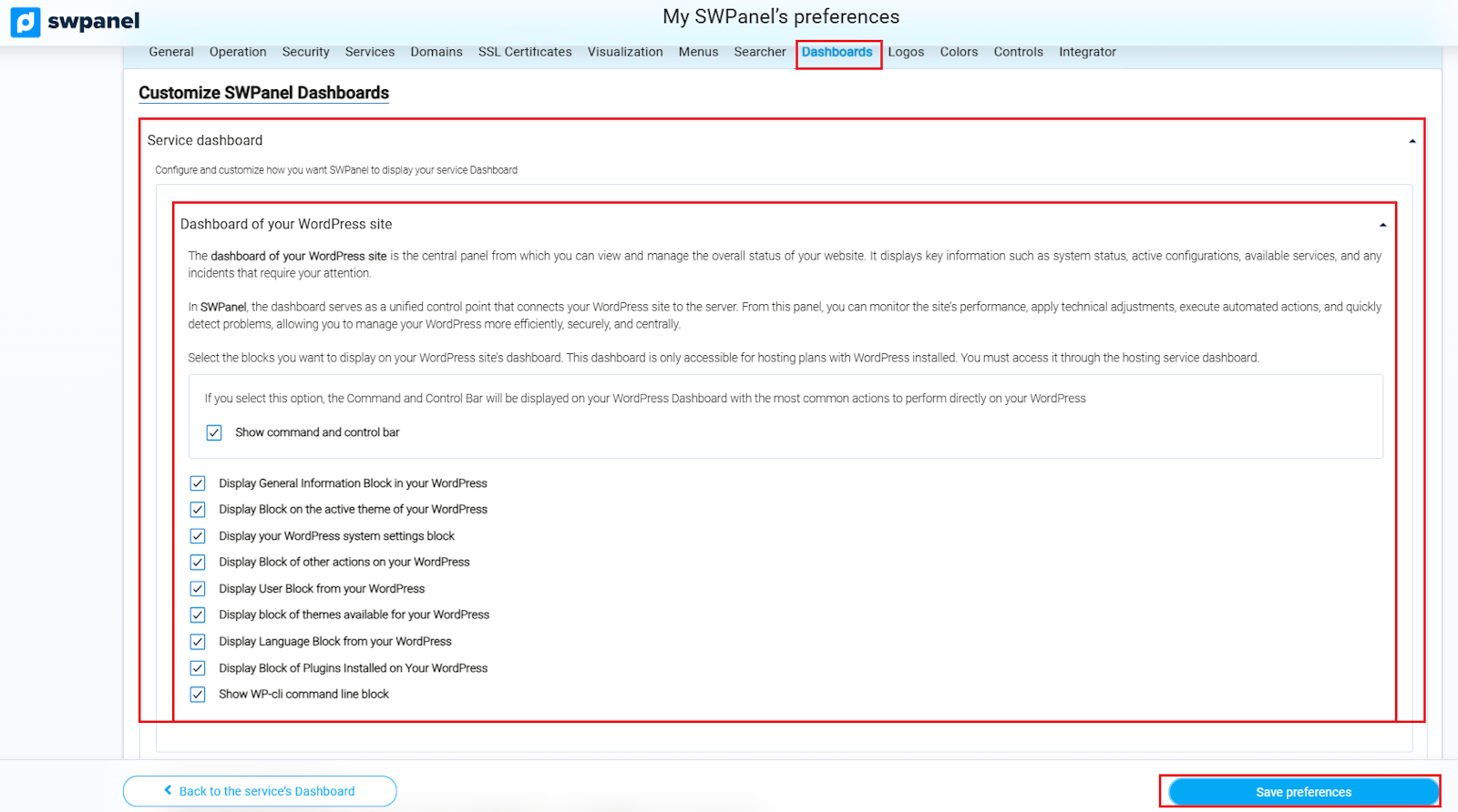 Desde este apartado puedes configurar y personalizar los diferentes Dashboards de SWPanel, incluyendo el Dashboard general, de cliente, de la Red de SW Ambassadors, módulo Integrador, revendedor de licencias, trazabilidad, soporte, servicios, WordPress, Cloud y módulo RHA.