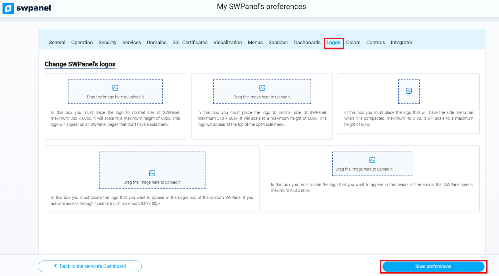 Puedes personalizar el logo que aparece en el menú lateral de tu SWPanel arrastrando la imagen sobre el área indicada.