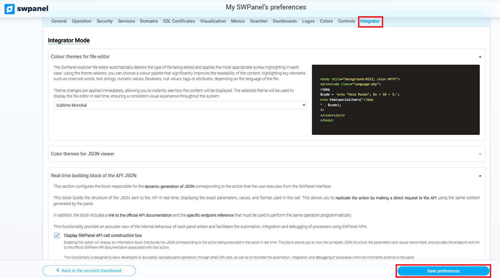 En el Modo Integrador, puedes configurar la visualización de las respuestas JSON de las APIs de SWPanel para que sean más claras y fáciles de leer: