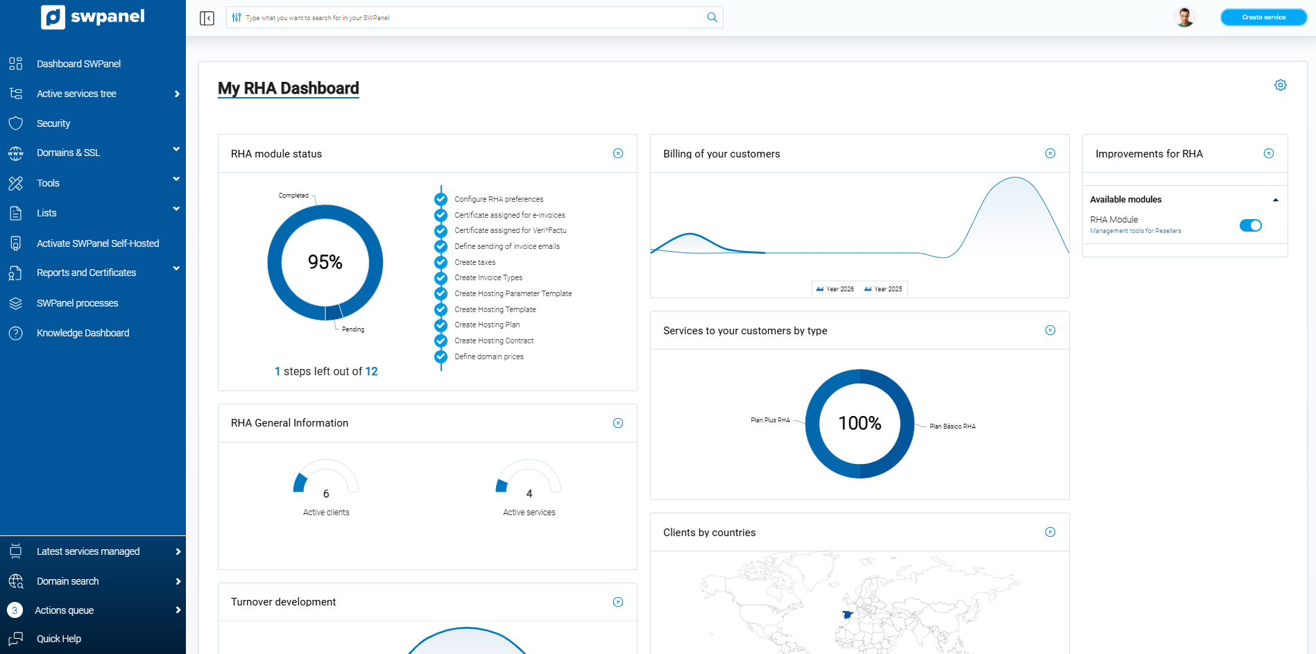 SWPanel's RHA module is a comprehensive solution designed specifically to automate all the administrative and financial processes of your digital hosting and domain sales business, combining simplicity and power in one place.