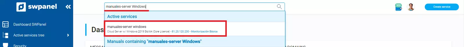 Para ello, entra a tu SWPanel y, mediante el buscador superior, accede al dashboard de tu Cloud con Windows: