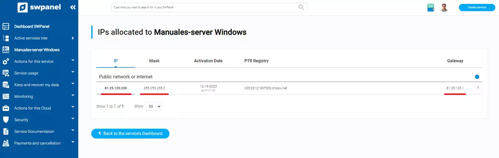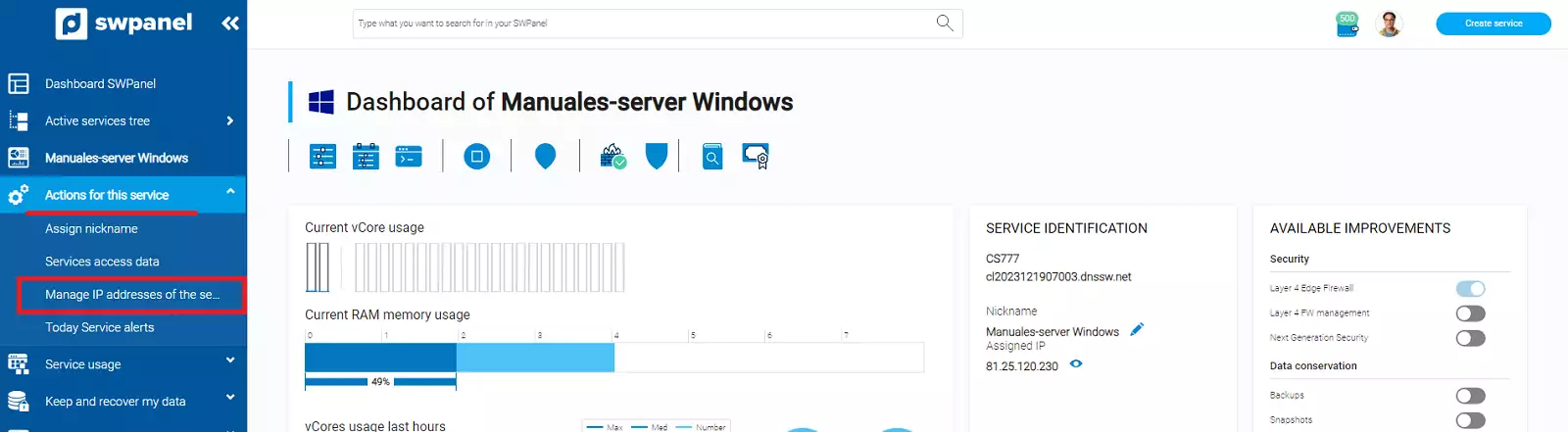 Posteriormente, desde el menú lateral, haz clic en "Acciones sobre este servicio" -> "Gestionar IPs del servicio":