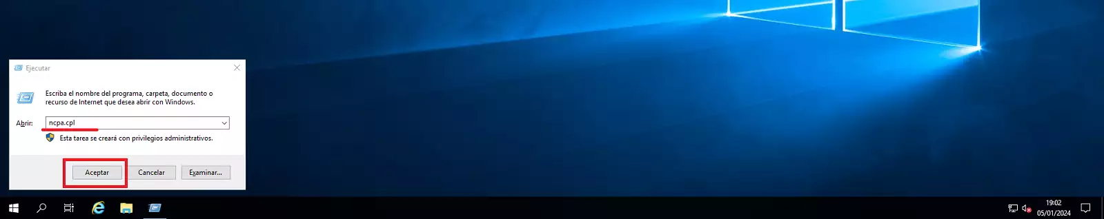 Posteriormente, presiona las teclas "Windows + R", en el cuadro de texto, escribe ncpa.cpl y por último, haz clic en aceptar: