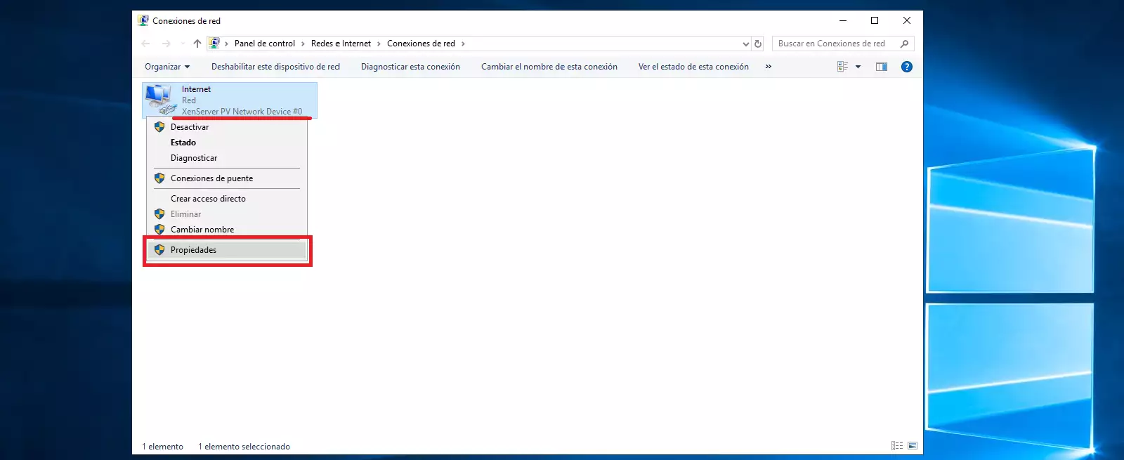 Haz clic derecho sobre el adaptador con nombre "internet" y, posteriormente, haz clic encima de Propiedades: