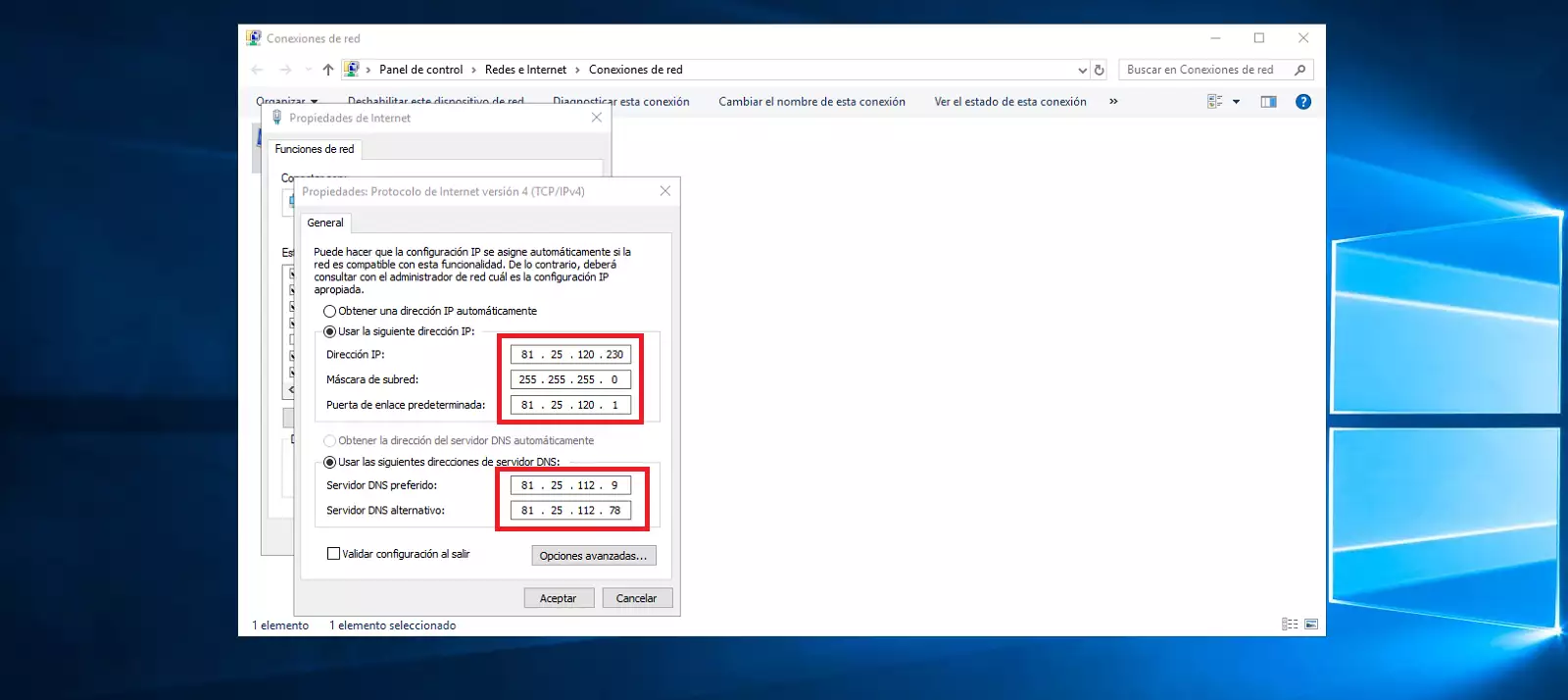En esta ventana dispondrás de la IP, máscara y puerta de enlace para configurar en el servidor: