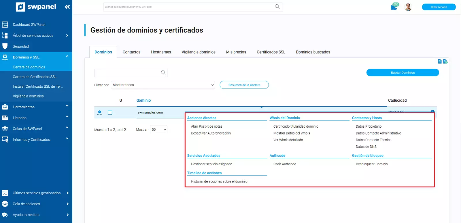 Cuando el dominio ya se encuentra en SW Hosting, tienes a tu disposición distintas herramientas en referencia al dominio, como por ejemplo ocultación del whois, el bloqueo... Para poder gestionar el dominio debes hacerlo directamente desde tu cartera de dominios.