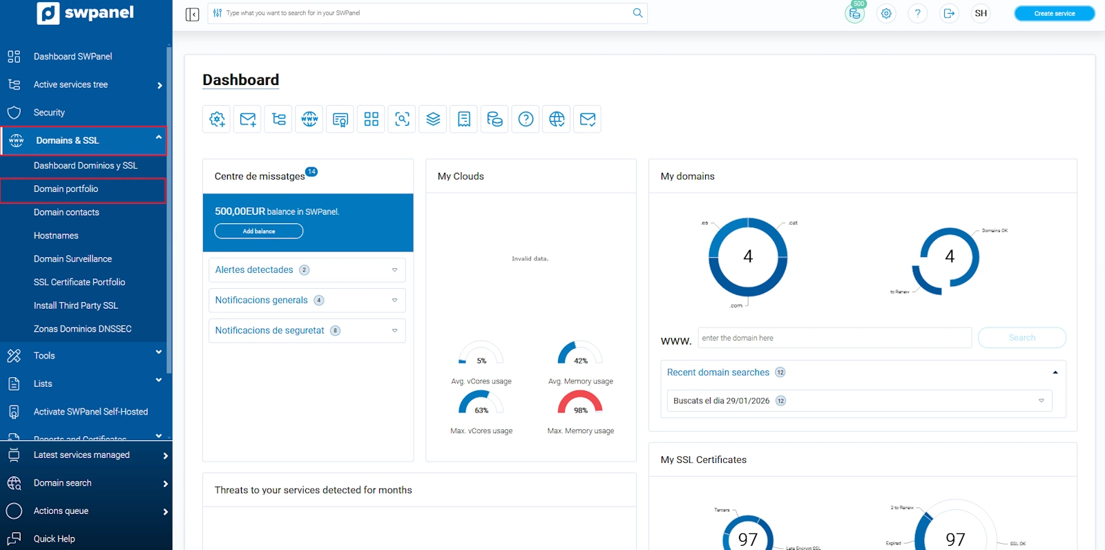 Accedir a: go.swpanel.com i fer clic sobre la pestanya “Dominis i Certificats”, situada en el menú lateral esquerre de color blau -> Cartera de dominis