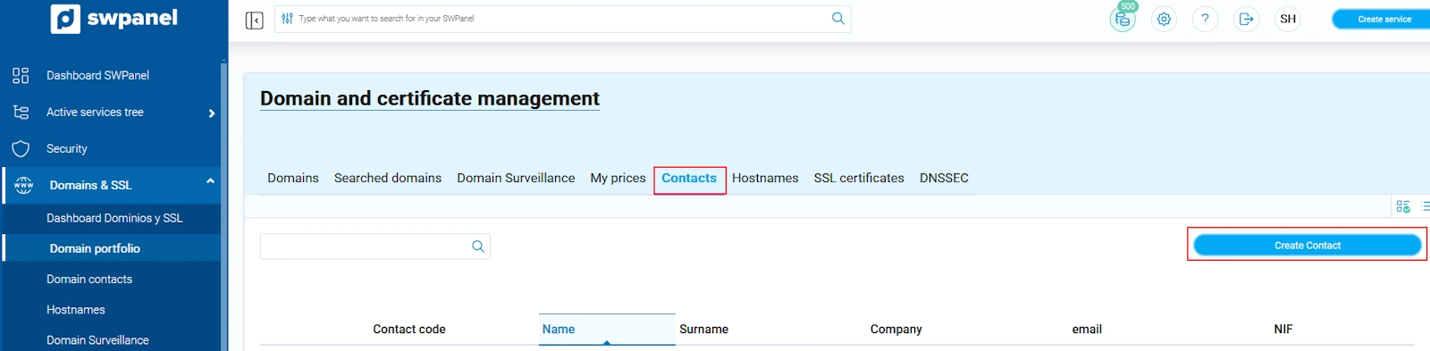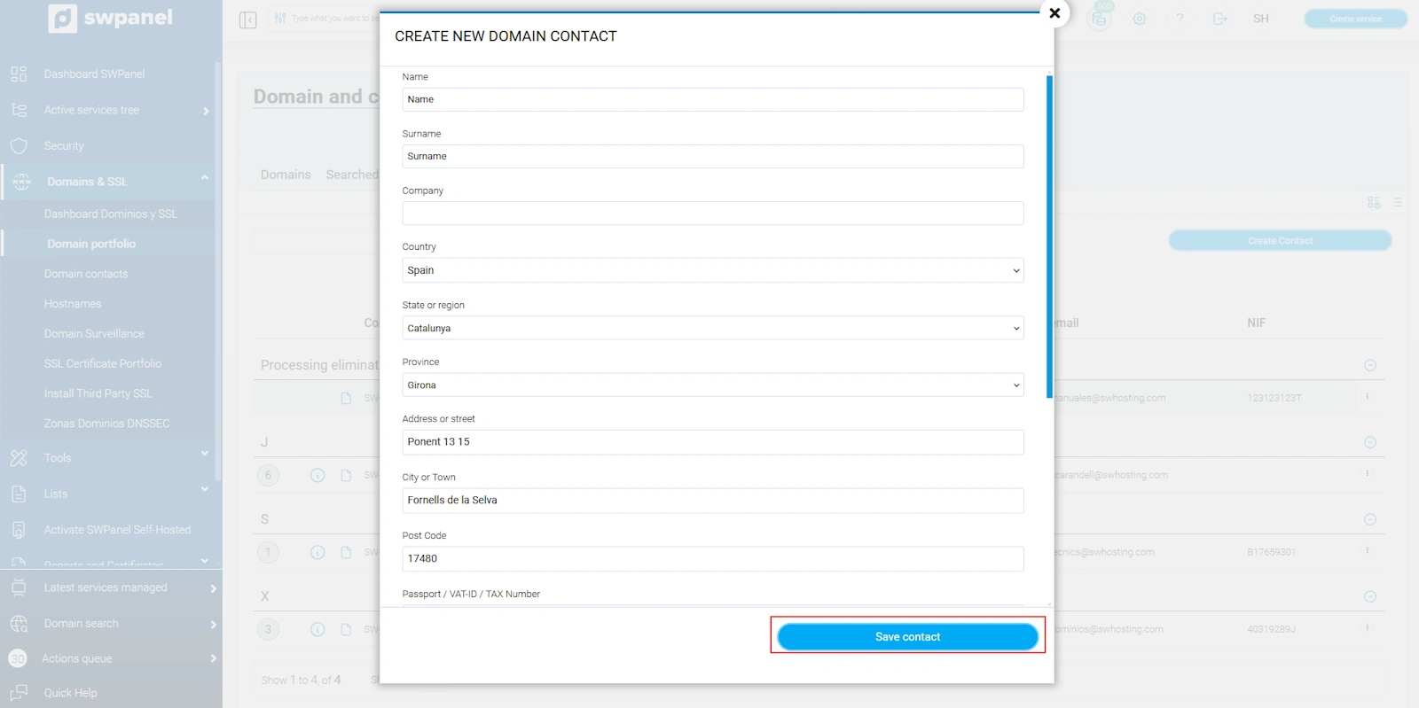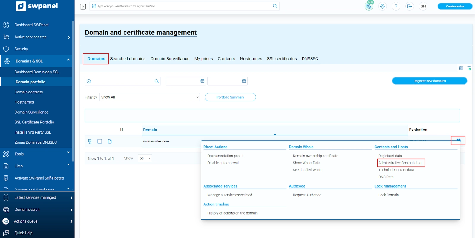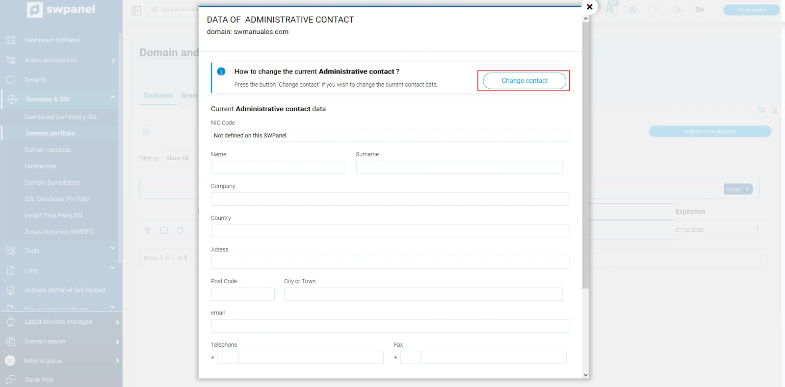 Qualsevol canvi referent al Contacte Administratiu i al Contacte Tècnic d’un domini s’ha de gestionar a través de l'SWPanel. No obstant això, aquest procediment s’aplica a totes les extensions excepte als dominis .es, que disposen d’un manual específic indicat més avall.