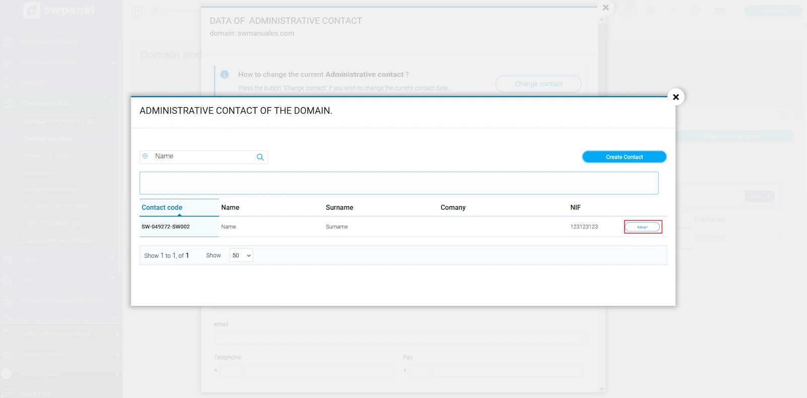 Aquí apareixeran tots els contactes que tinguis creats al teu SWPanel. Selecciona el contacte desitjat i fes clic a “Assignar”