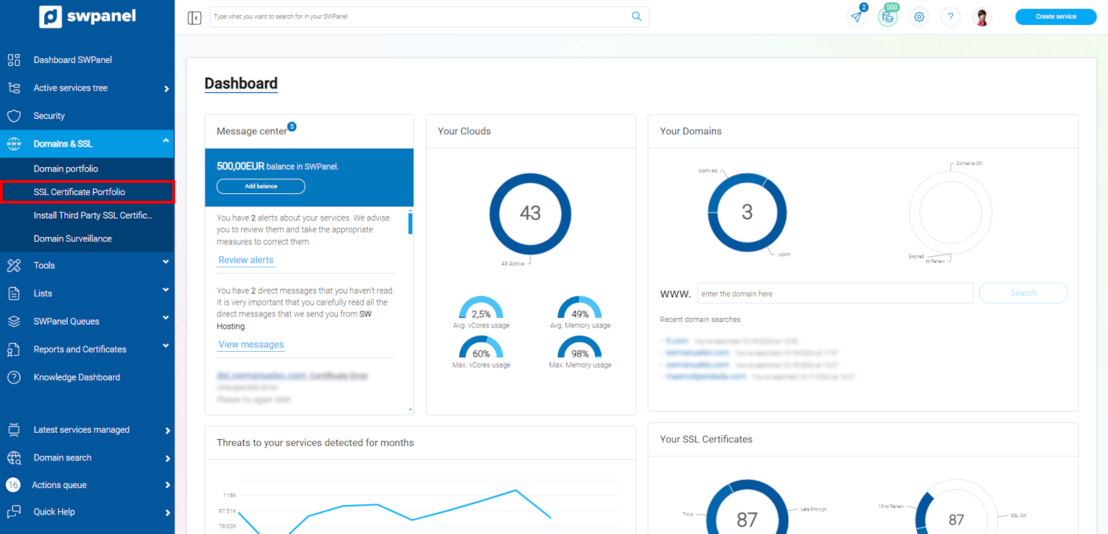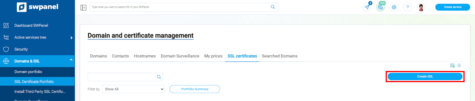 Per contractar qualsevol dels nostres certificats disponibles en cartera hauràs de situar-te al teu SWPanel i seleccionar, al menú lateral esquerre blau dins de l'apartat "Dominis i Certificats", el submenú "Cartera de Certificats SSL".