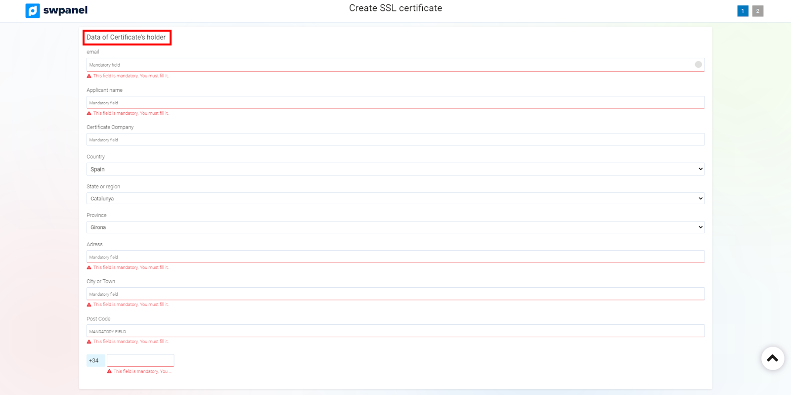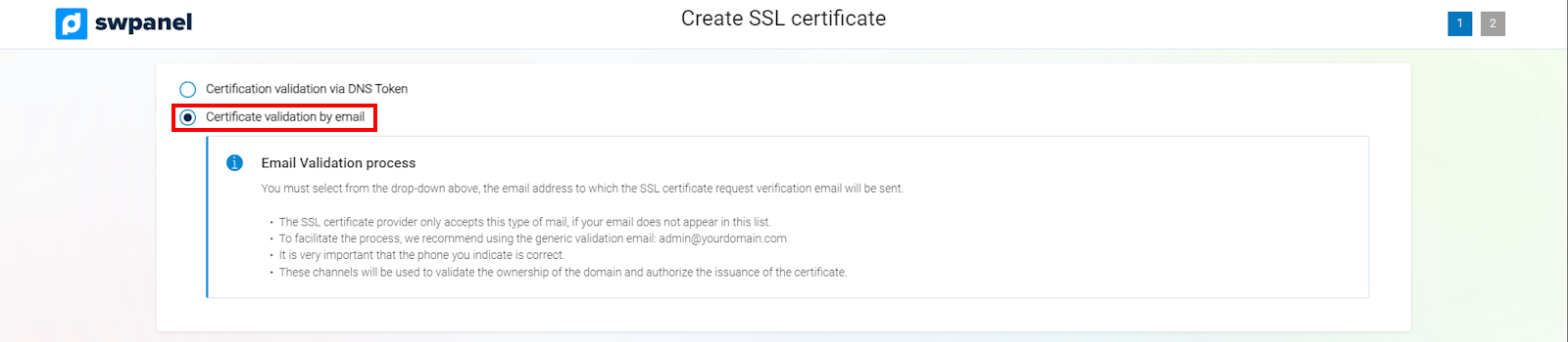 Un cop hagis emplenat totes les dades del formulari que el SWPanel et mostra, rebràs un email de validació al compte de correu [email protected]. Si no hi ha cap compte creat com a "admin", hauràs de crear-lo. Posteriorment, quan ja hagis validat aquest correu, rebràs un altre correu amb el certificat adjunt a l'adreça de correu electrònic que figura com a propietari del certificat. A continuació, si el teu servidor compta amb llicència d'ús de SWPanel, podràs instal·lar-lo al teu servidor a través de les eines disponibles en la gestió de certificats, les quals us expliquem a continuació.