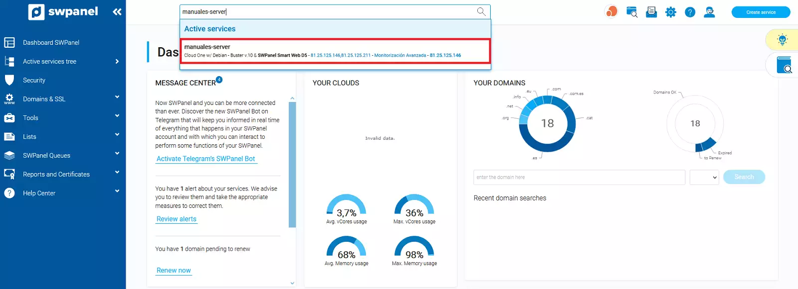 1. Dins del teu SWPanel utilitza el cercador per a trobar el teu Cloud, en el nostre cas es diu manuals, el teu tindrà un nom diferent. Una vegada el trobis, selecciona'l.