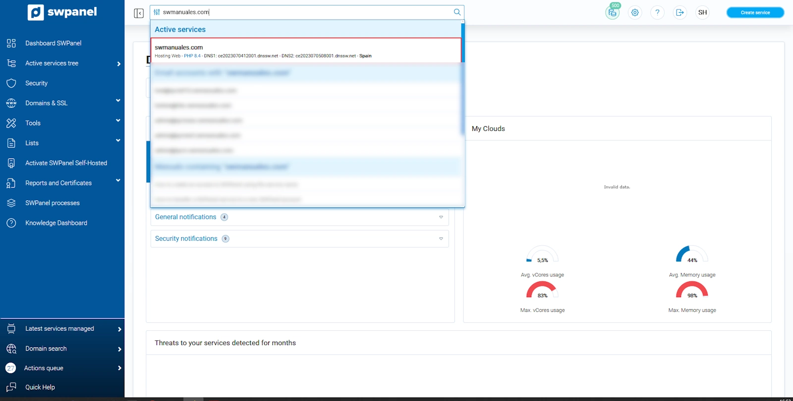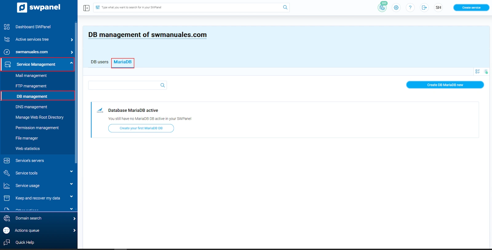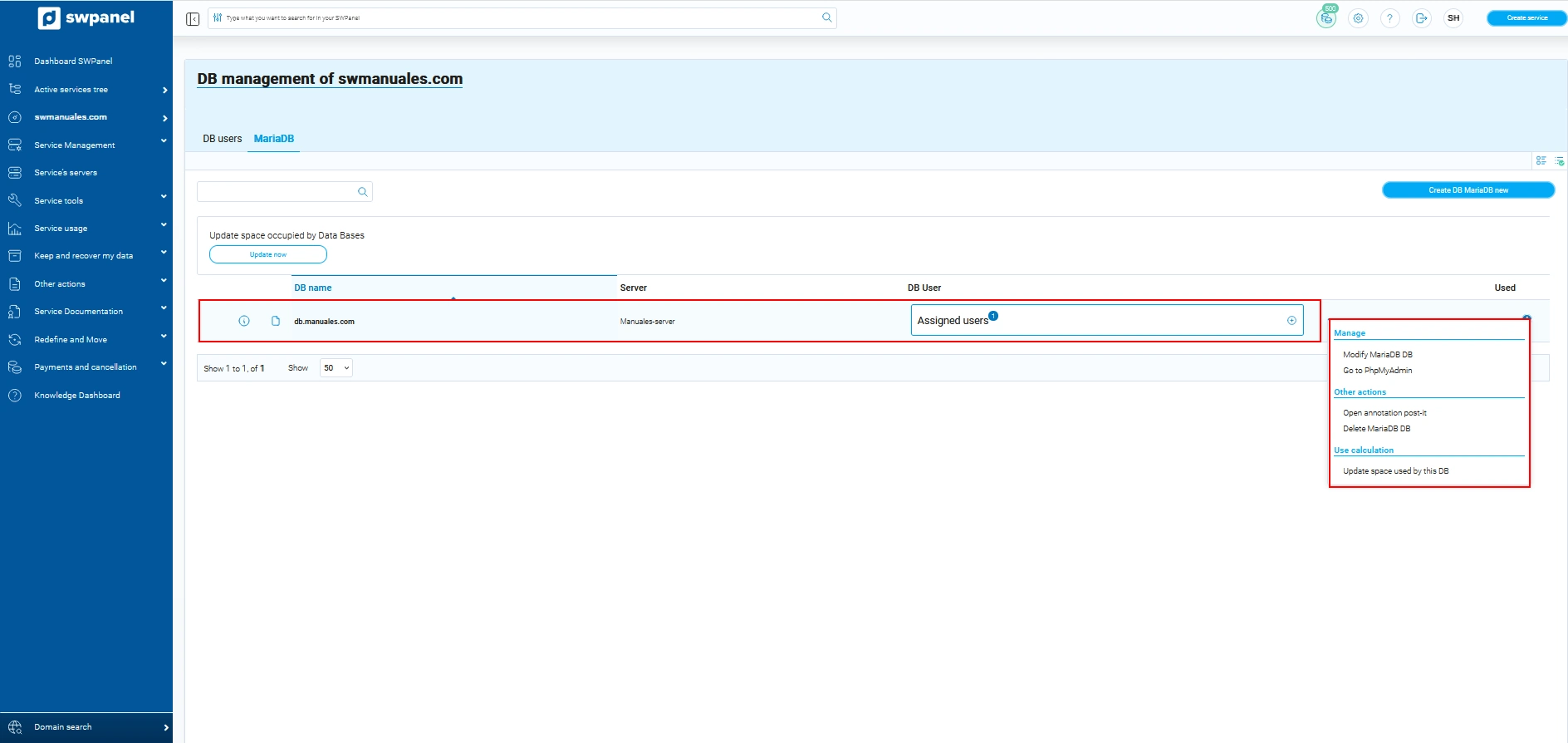 1. Un cop hagis creat l'hostalatge per al teu lloc web hauràs d'indicar el servei sobre el qual vols crear la teva base de dades. Per això pots utilitzar la finestra de cerca ubicada a la part superior de l 'SWPanel. Un cop localitzat, prem sobre el seu nom per accedir al seu Dashboard.