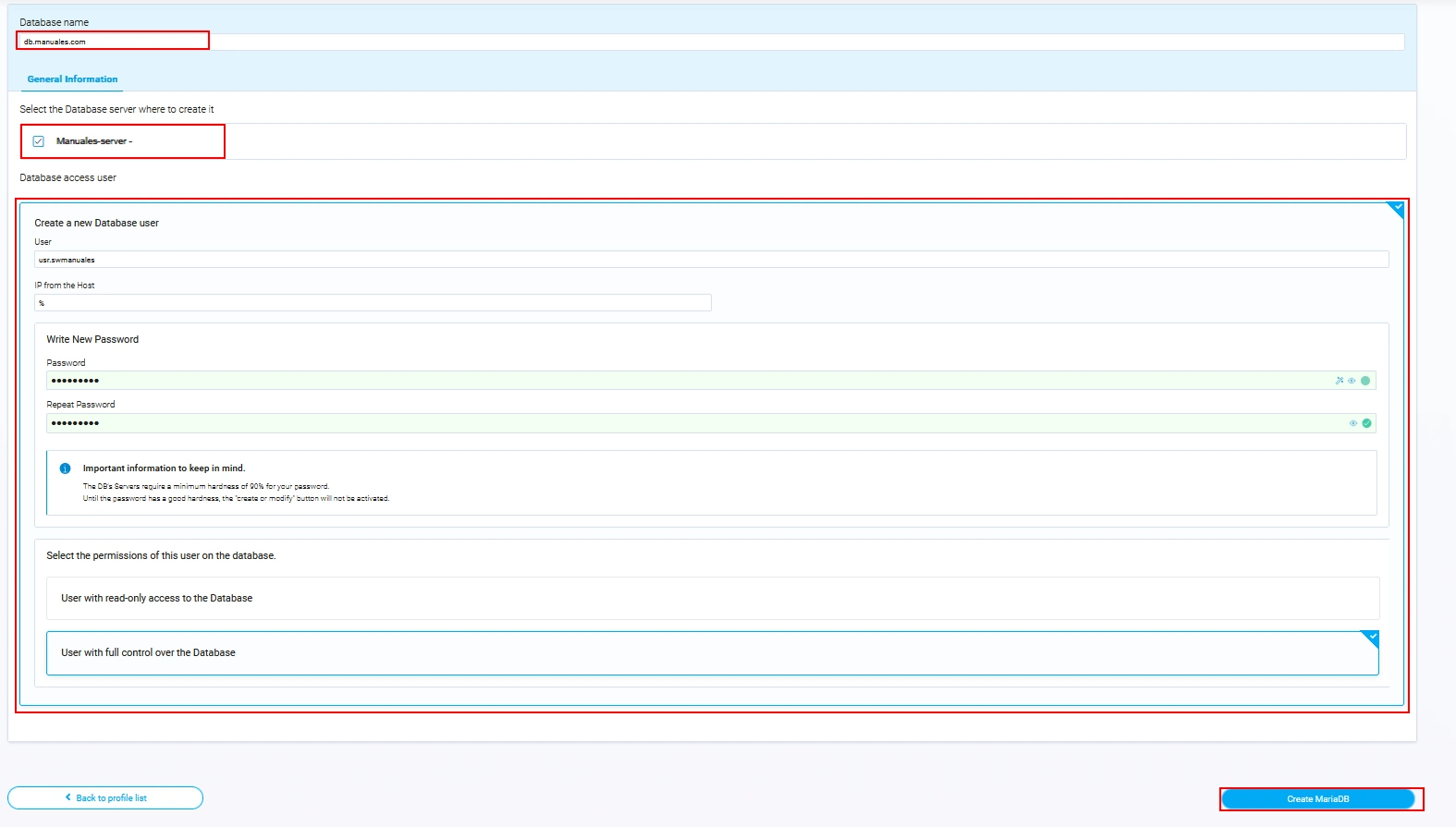 Per finalitzar la creació de la base de dades i l'assignació de l'usuari amb els permisos corresponents, fes clic sobre el botó Crear MariaDB.