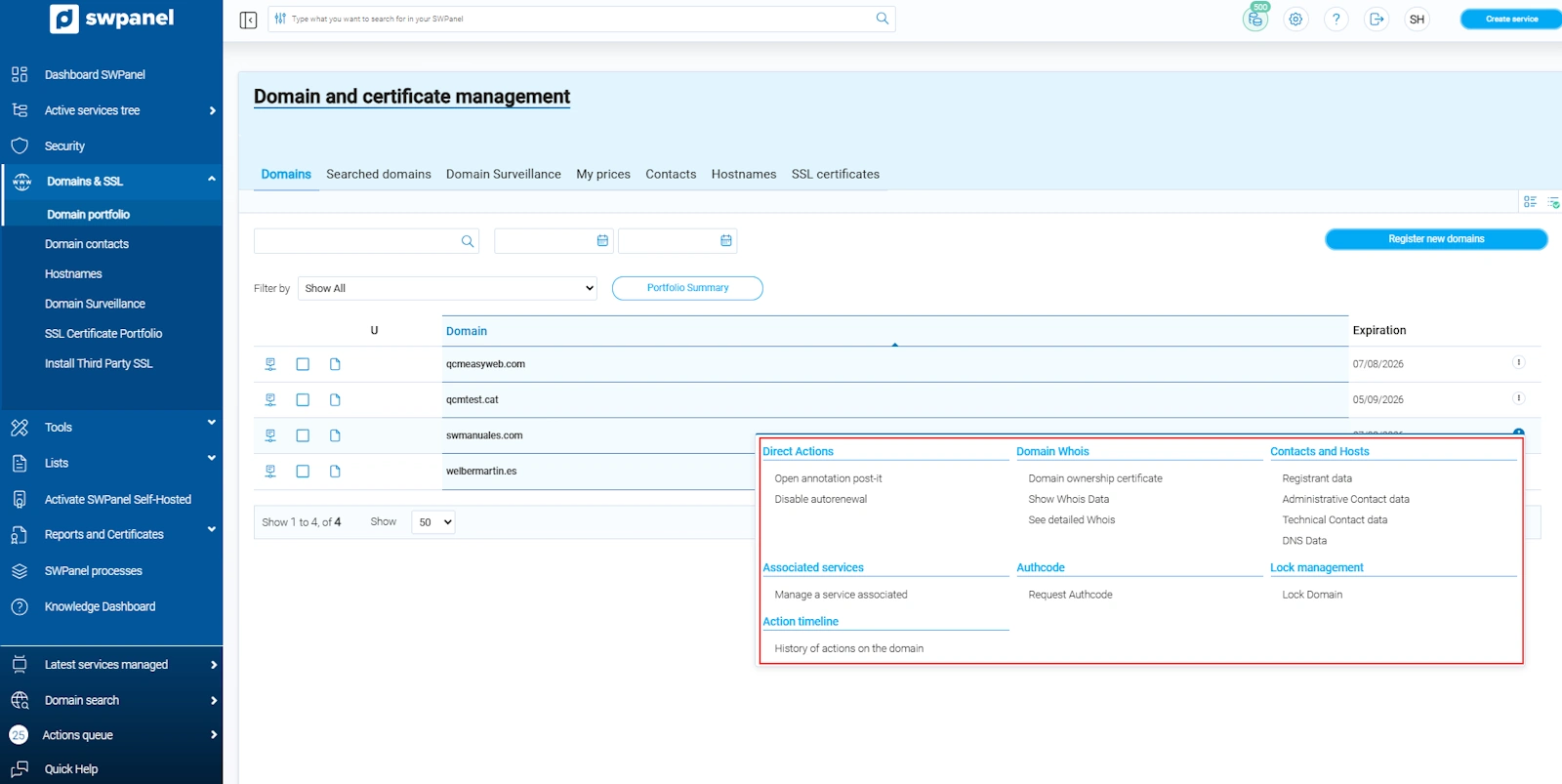 Aquí trobaràs tots els dominis que tinguis registrats a SW Hosting. Desglossarem cadascuna de les opcions que et mostra el SWPanel per a cadascun dels dominis: