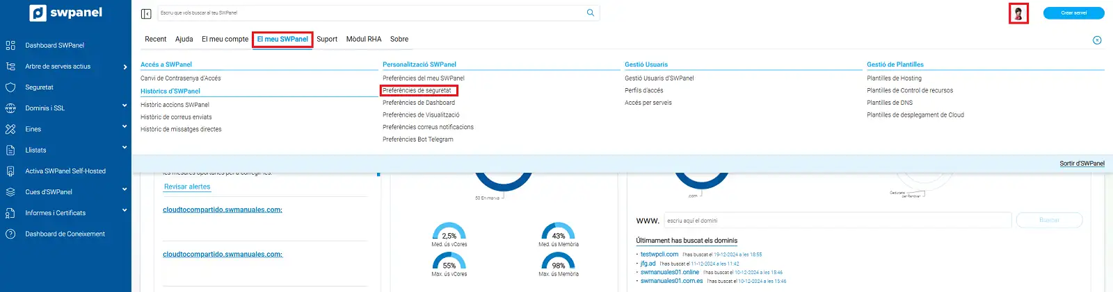 En primer lloc hauràs de dirigir-te al teu compte d' SWPanel. Una vegada allà, per a obrir el menú contextual, prem sobre la teva icona de client que trobaràs a la cantonada superior dreta, selecciona la pestanya , "El meu SWPanel", i tria l'apartat "Preferències de Seguretat".