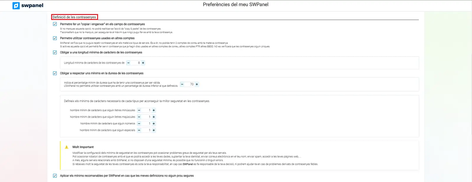 Efectivament, per a la teva comoditat o la dels teus clients finals, pots personalitzar els límits de les teves contrasenyes des de les teves preferències de seguretat en SWPanel.