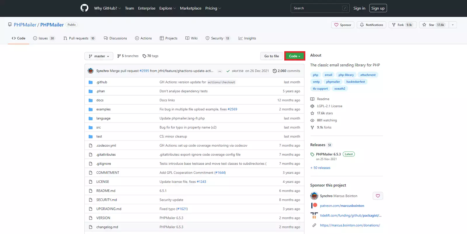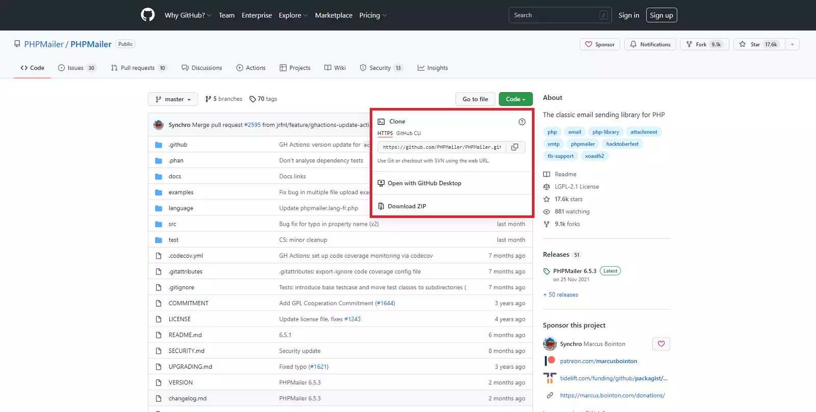 1.- Descarregar la llibreria de https://github.com/PHPMailer/PHPMailer, click al botó verd de “Clone or download” i “Download ZIP”