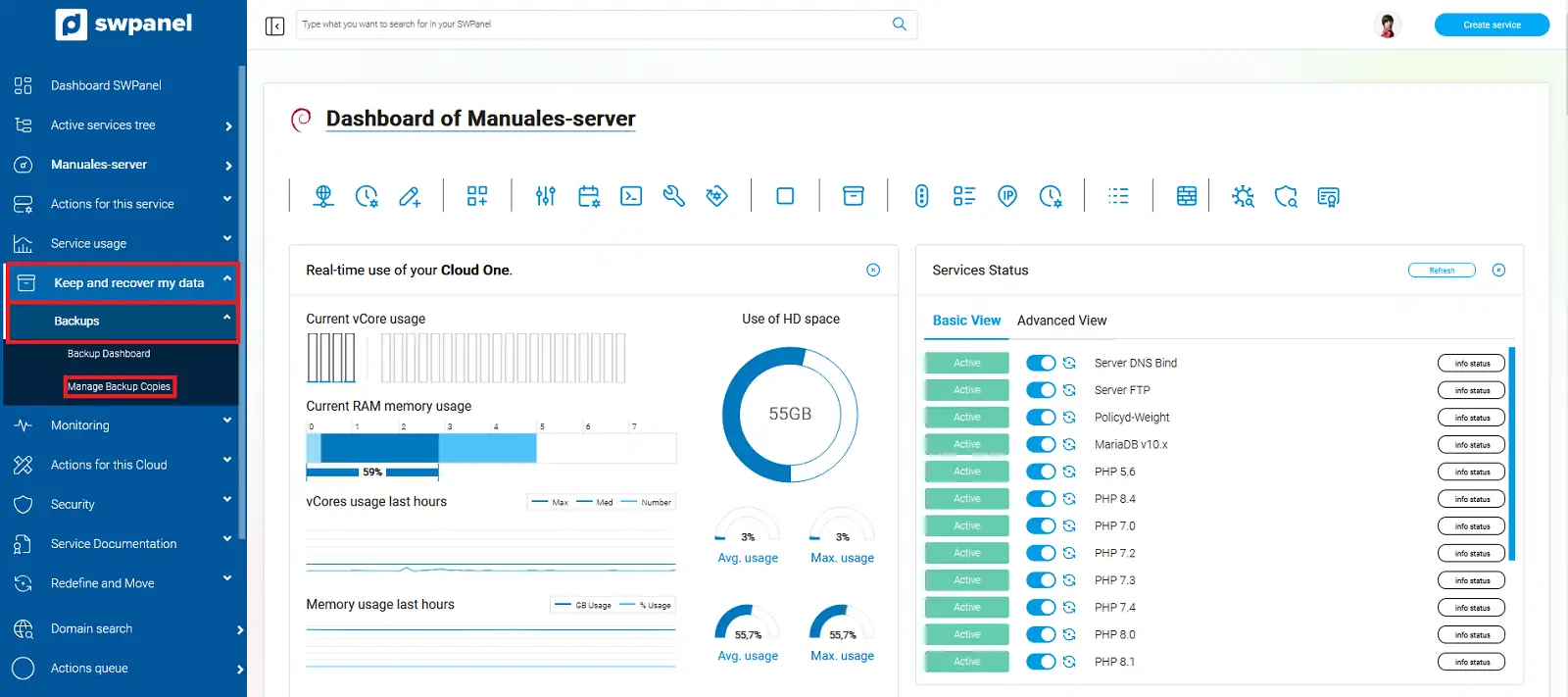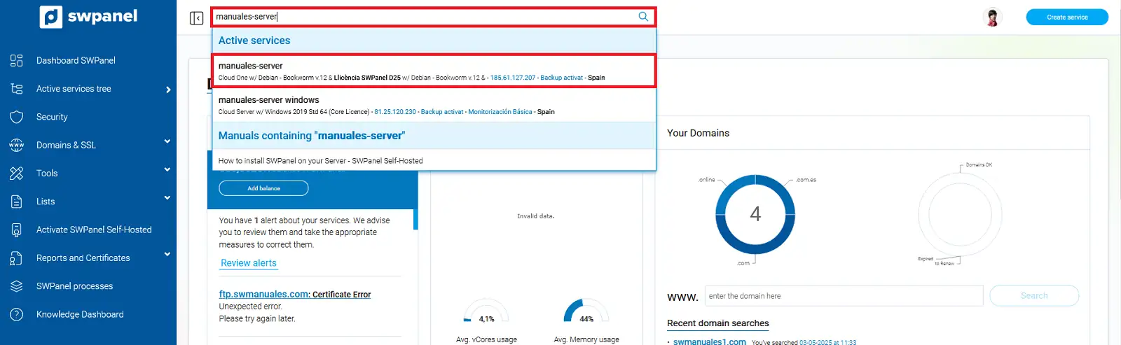 Dins del teu SWPanel, utilitza el cercador superior per localitzar el teu Cloud. En el nostre cas, es diu Manuales-server, però el teu tindrà un nom diferent. Un cop el trobis, selecciona'l.