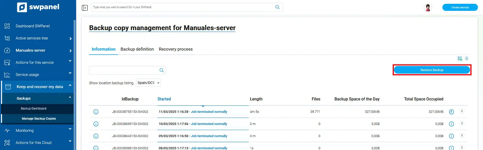 En pocs minuts, les dades estaran restaurades en el directori indicat. Hi podràs accedir mitjançant FTP o SSH. Es recomana mantenir els permisos i usuaris originals per evitar problemes de funcionament.