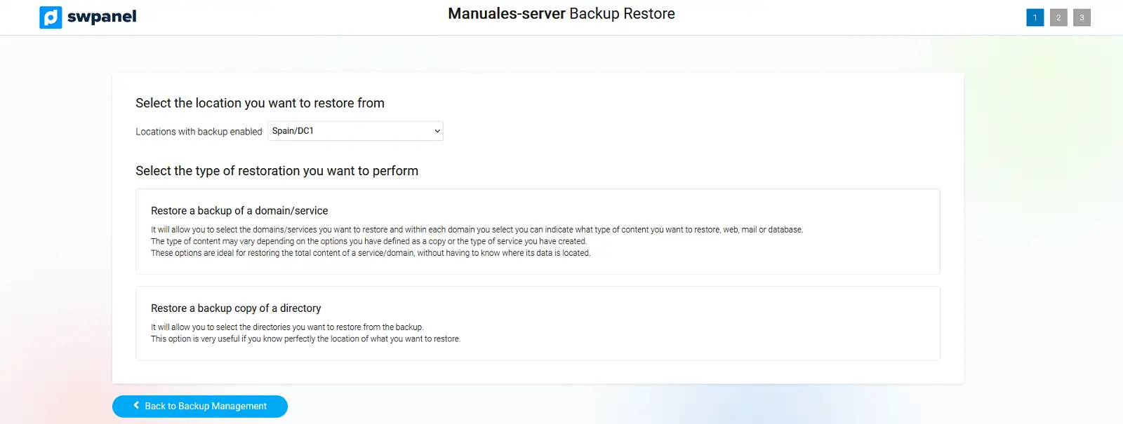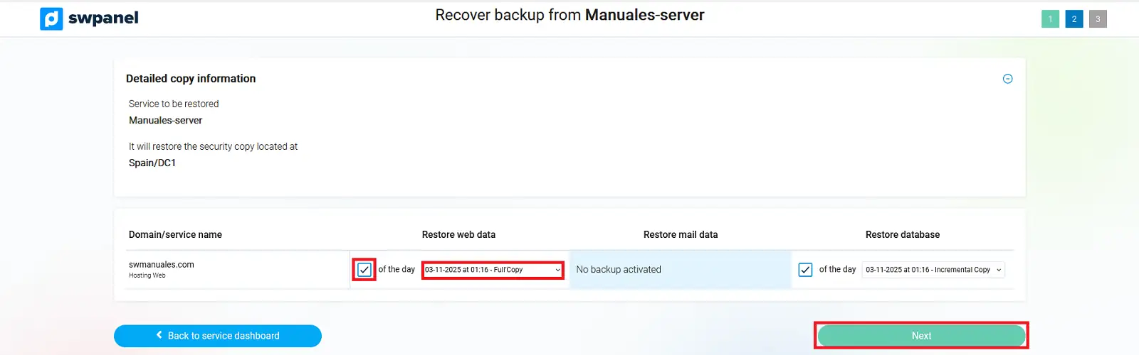 Aquesta opció permet restaurar un domini o un servei complet. Es pot triar entre les diferents dates de còpies disponibles i seleccionar el contingut a restaurar (web, correu o base de dades):
